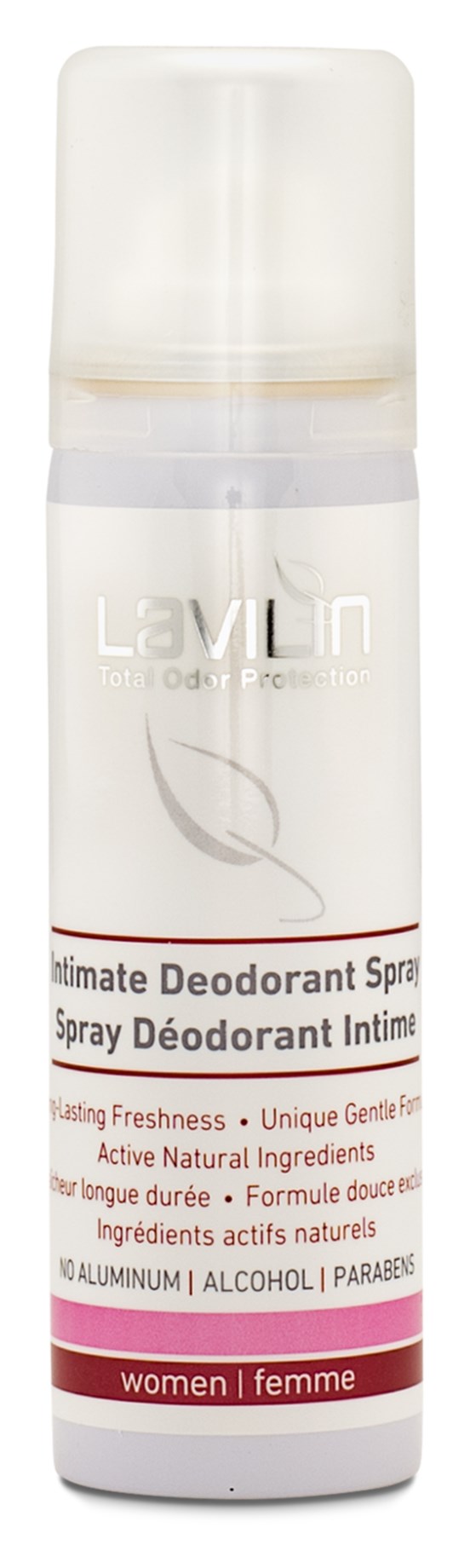 Lavilin Intimate Deodorant Spray är en liten och smidig sprayflaska med deodorant som är särskilt anpassad för intimområden. Den milda, naturliga formulan både motverkar lukt och har samtidigt en vårdande effekt på huden tack vare lugnande ingredienser som kamomill och trollhassel. Lavilin Intimate Deodorant Spray innehåller även probiotika som bidrar till en god bakterieflora och sprayen är endast lätt parfymerad. Använd sprayen för att få en fräsch känsla som håller i sig länge.