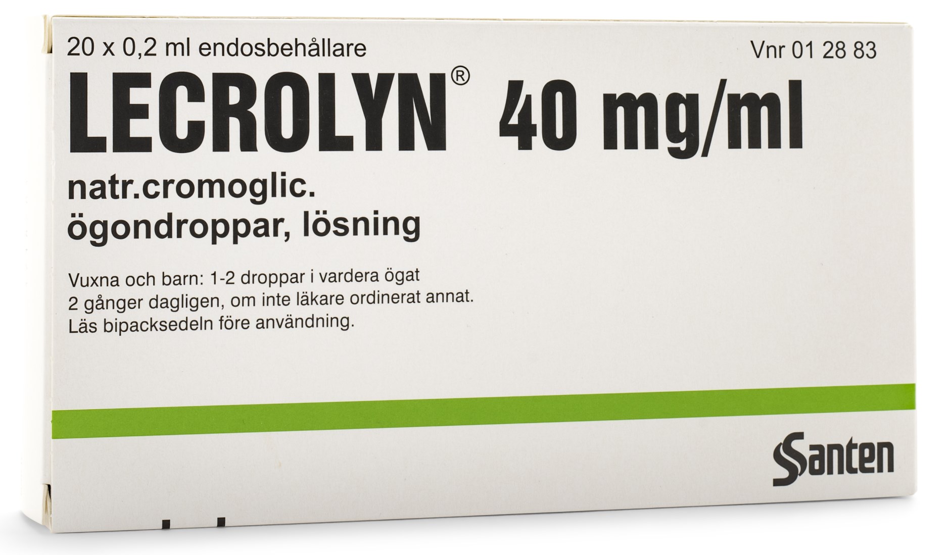 Lecrolyn Ögondroppar 40 mg/ml är hjälpen för dig som lider av rinnande, kliande och röda ögon till följd av allergier. Lecrolyn Ögondroppar innehåller natriumkromoglikat som förhindrar frisättningen av de ämnen som framkallar inflammationer i ögats slemhinna. Genom att hindra ämnena från att frisättas behöver växtpollen och andra allergener inte orsaka samma ökade tårflöde och obehag. 1-2 droppar två gånger om dagen räcker för att besvären ska minska avsevärt.