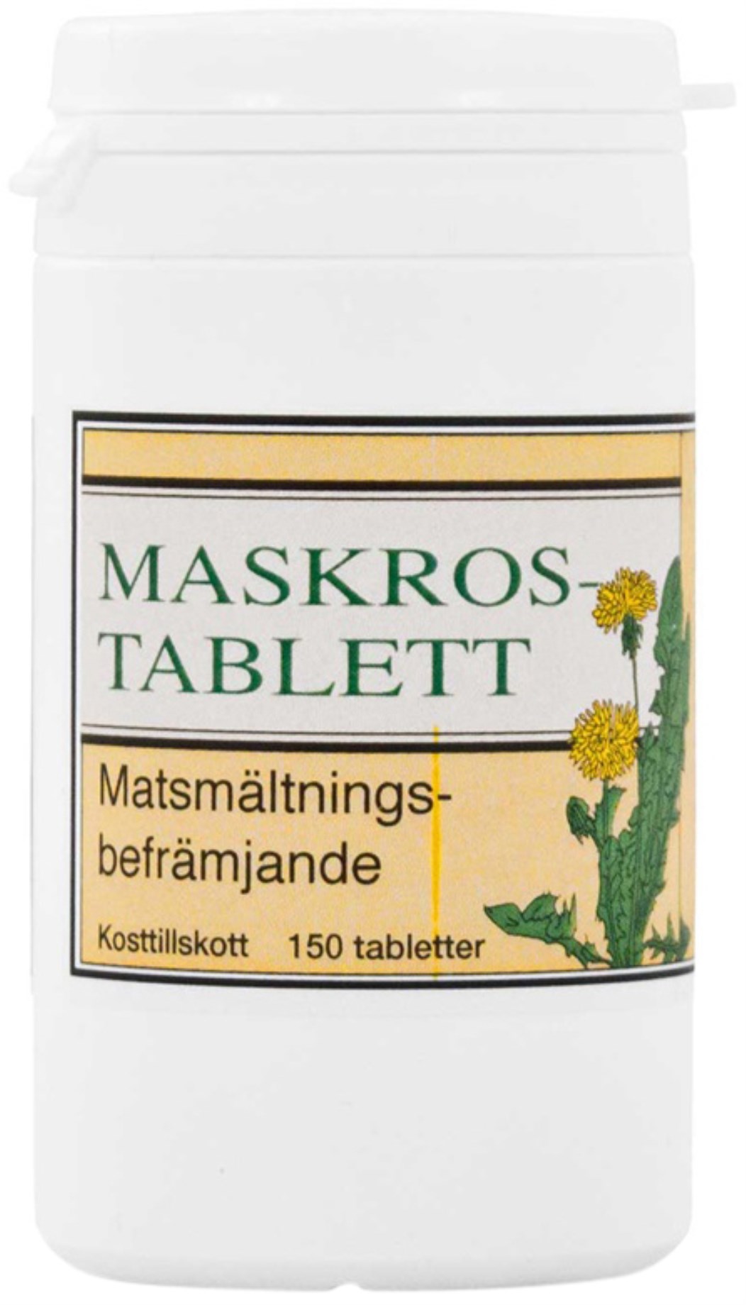 Maskrostabletten innehåller extrakt från maskros och varje tablett ger 100 mg. Maskrosen är en flerårig ört som ofta betraktas som ett ogräs men som även använts genom historien för sina positiva egenskaper och sitt näringsinnehåll. Roten innehåller mycket kolhydrater och bladen är rika på vitamin C.