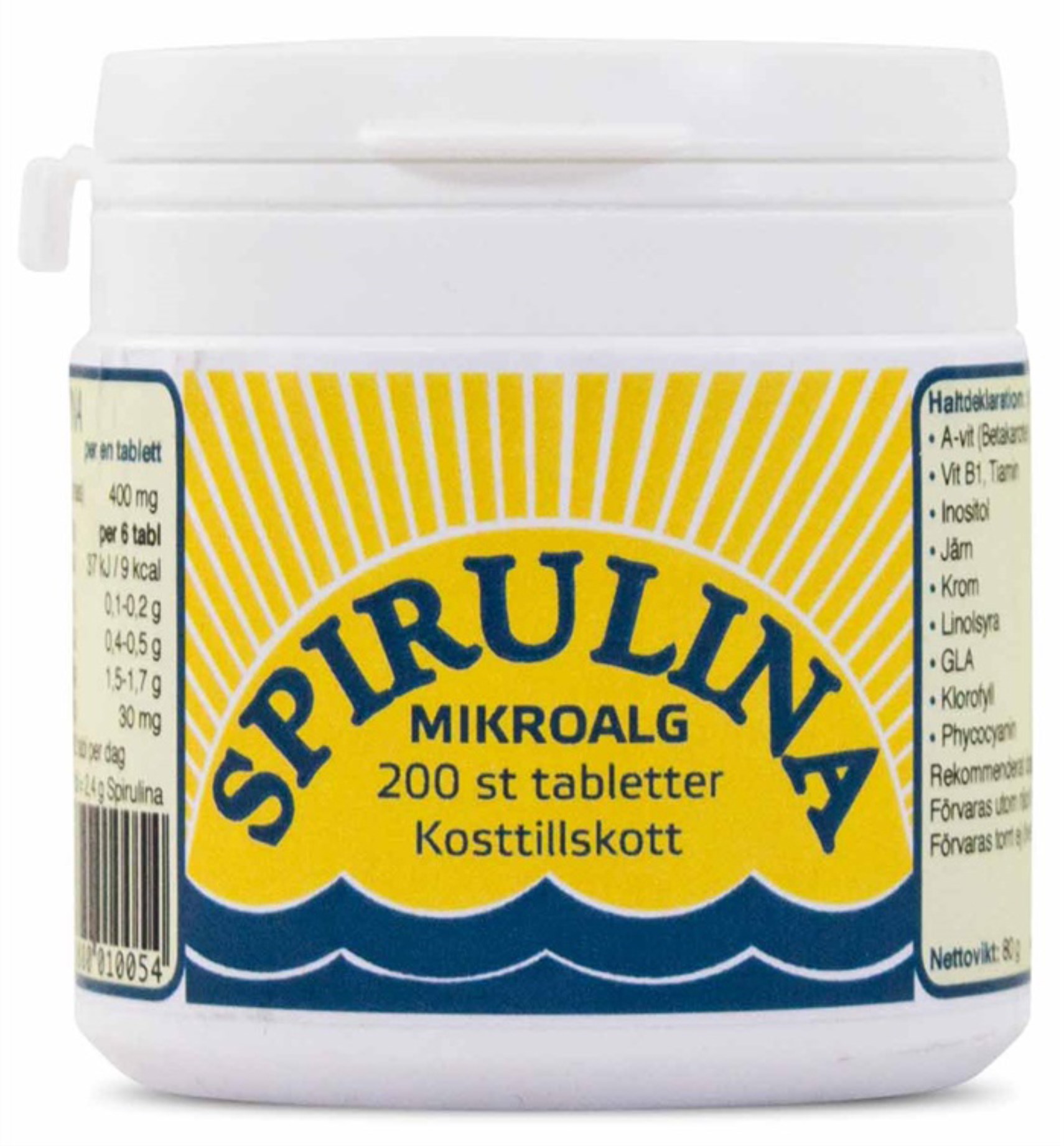 Spirulina är en näringsrik och odlad mikroalg. Algen odlas i kontrollerade bassänger och hanteras varsamt i produktionen så att alla näringsämnen ska bevaras. Spirulina är en av världens mest näringsrika växter som innehåller över 100 näringsämnen som är bra för kroppen. Den är bland annat rik på protein samt järn och betakaroten.
