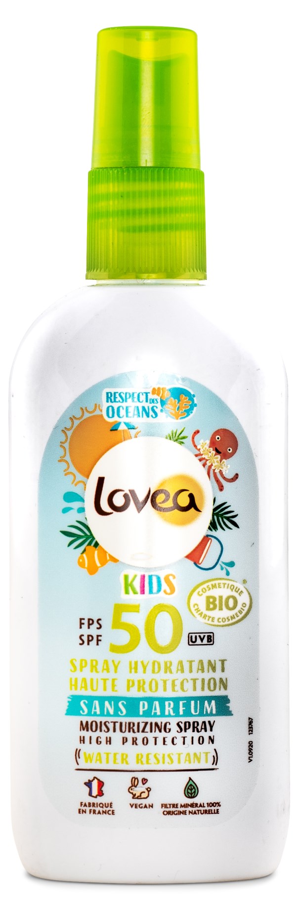 Lovea ORGANIC KID High Protection Moisturizing Spray SPF50 är ett solskydd för barn med högt SPF. Den både skyddar och återfuktar barnets hud. Solsprayen innehåller ett 100 % fysikaliskt solfilter som effektivt skyddar barnets hud mot solens farliga UVA/UVB-strålar. Flaskan är även dekorerad med någon av Disneys figurer. För barn över 3 år.