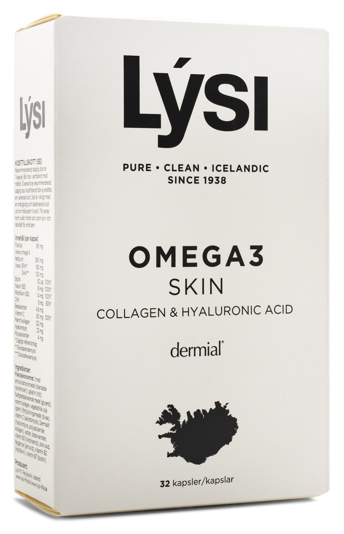 Lýsi Omega-3 Skin är ett speciellt framtaget kosttillskott för att ge huden vård inifrån så att den kan stråla på utsidan! Dessa kapslar innehåller sammansättningen Dermial® med det kroppsegna ämnet hyaluronsyra, som har en vätskebindande förmåga. Det gör att hyaluronsyran bidrar till att hålla huden återfuktad, samtidigt som den bidrar till hudens elasticitet. Dessutom innehåller Lýsi Omega-3 Skin också biotin och zink vilka båda bidrar till att behålla hudens normala välmående, samt kollagen från marint ursprung. Kollagen är ett av våra mest använda tillskott för hud, hår och naglar eftersom det finns naturligt på dessa ställen, där det bygger upp styrka. Lýsi Omega-3 Skin innehåller även omega-3, vilket tillför viktiga fettsyror som DHA och EPA till kroppen.