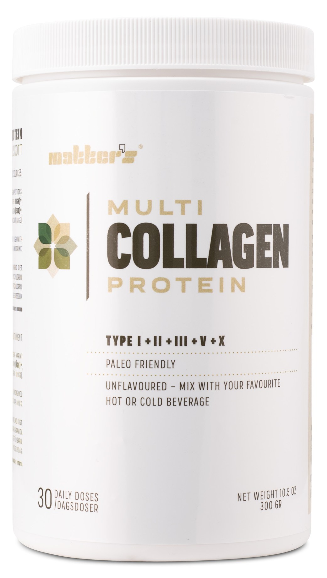 Matters Multi Collagen är ett naturligt kollagenprotein baserat på 4 olika råvaror; fisk, biff, kyckling och ägg. Kollagen stödjer hela kroppen, den bidrar till friskare hud, hår och naglar men också friskare leder, benstomme och ligament. Matters Multi Collagen innehåller kroppens vanligaste kollagentyper 1, 2, 3, 5 och 10. Tillskottet har en neutral smak och löses enkelt upp i både varma och kalla drycker, du blandar det smidigt i ditt kaffe, te, i en smoothie eller varför inte i dina pannkakor?