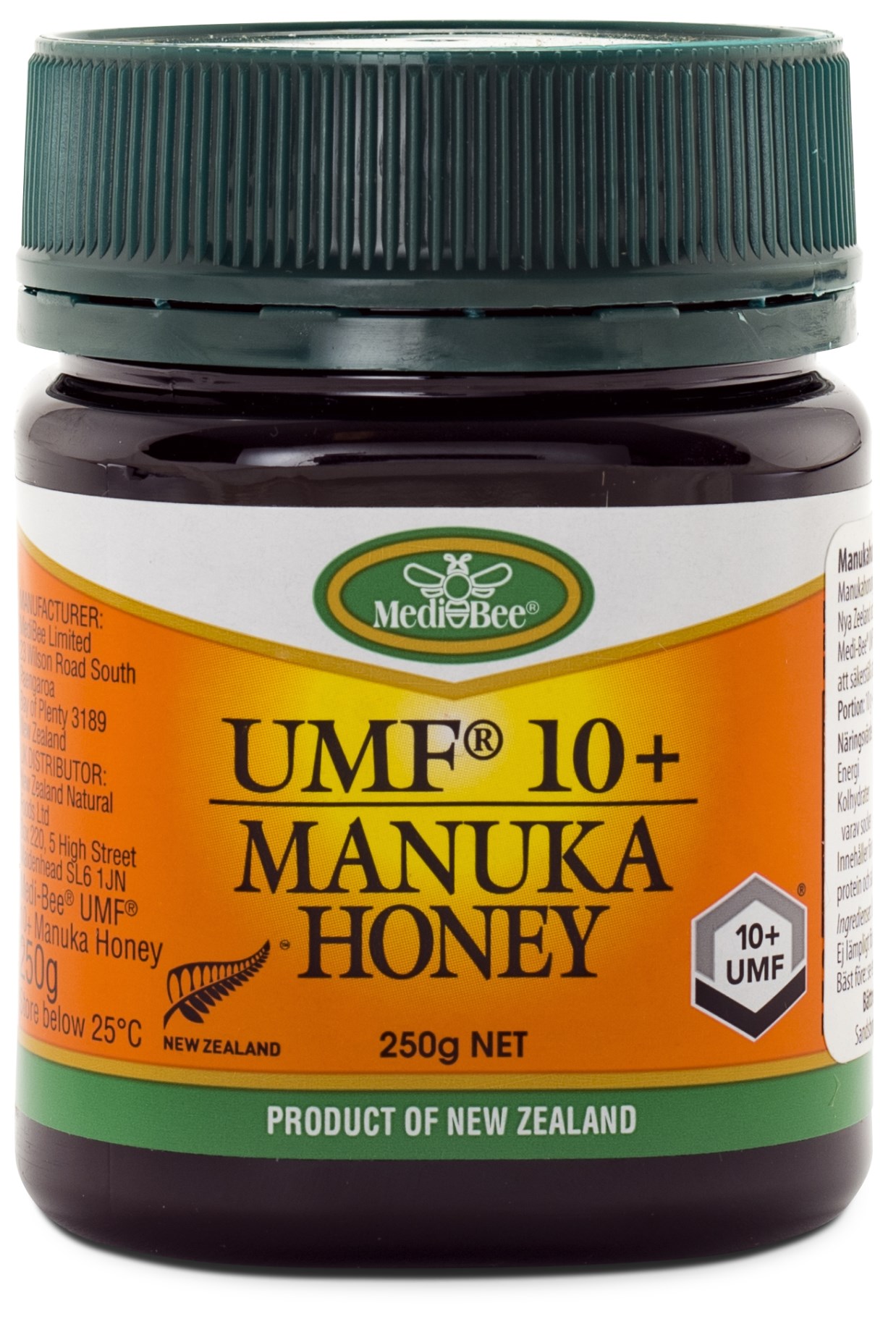 MediBee Manukahonung UMF 10+ är en fast honung med unika egenskaper. Manukahonungen från MediBee är en äkta manukahonung från Nya Zeeland, som produceras genom att bin använder nektar från manukabuskens blommor. Manukahonungen får därigenom ett betydligt högre näringsinnehåll och verksamma komponenter med antibakteriella egenskaper än vanlig blomsterhonung. Den antibakteriella faktorn tillsammans med näringsinnehållet mäts i den internationella enheten UMF (Unique Manuka Factor), där 5+ anses vara tillräckligt och 10+ är bra. Manukahonung kan användas som daglig hälsokost eller i perioder, exempelvis i förkylningstider. En matsked är rekommenderad maxdos per dag.