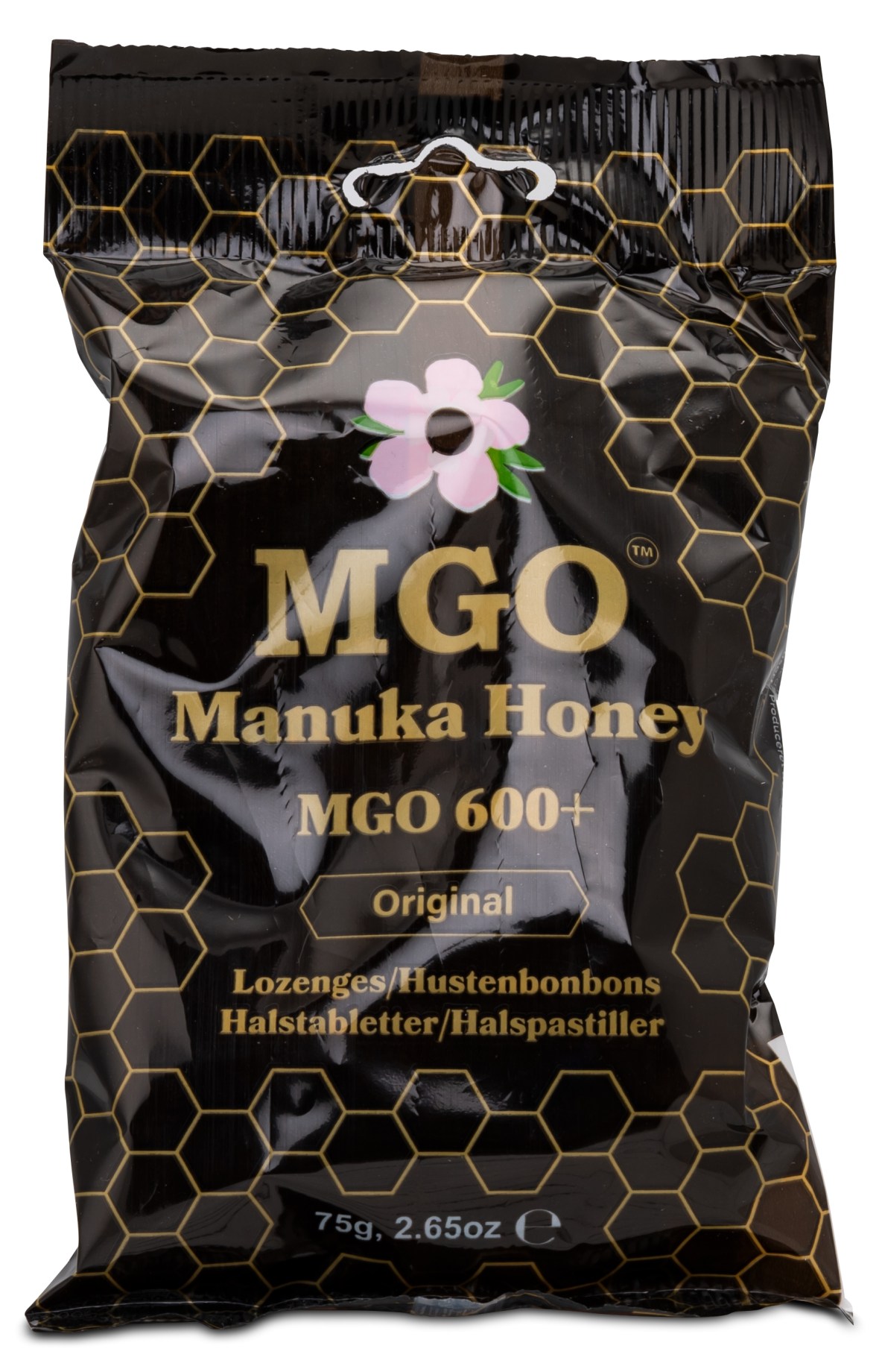 MGO Manukahonung Halstabletter 600+ är goda halstabletter med med manukahonungens unika smak och egenskaper. Halstabletterna innehåller 15 % äkta manukahonung från Nya Zeeland, berikat med naturlig Methylglyoxal (MGO). Lenande för halsen och lätt att ta med i fickan. Då det är en naturlig produkt kan variationer i smak och konsistens förekomma.