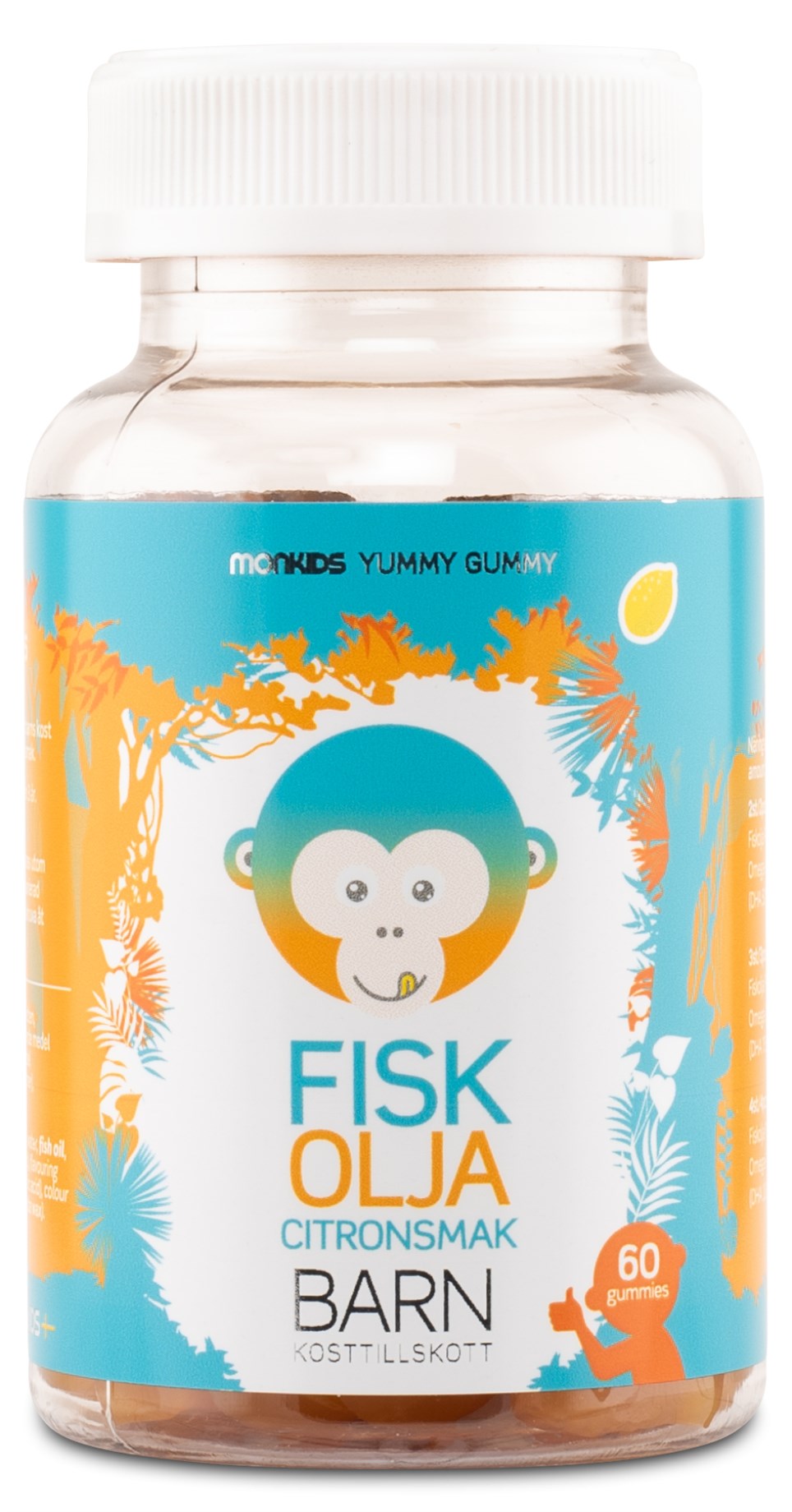 Säkerställ barnets dagliga intag av omega-3 med Monkids Fiskolja, små geléfiskar med mikroinkapslad fiskolja. Monkids Fiskolja ska tuggas och har en god citronsmak helt utan bismak. Gelétuggisarna har färgats naturligt av frukt och grönsaker. Monkids Fiskolja för barn är helt utan gelatin och innehåller dessutom inga artificiella sötningsmedel.