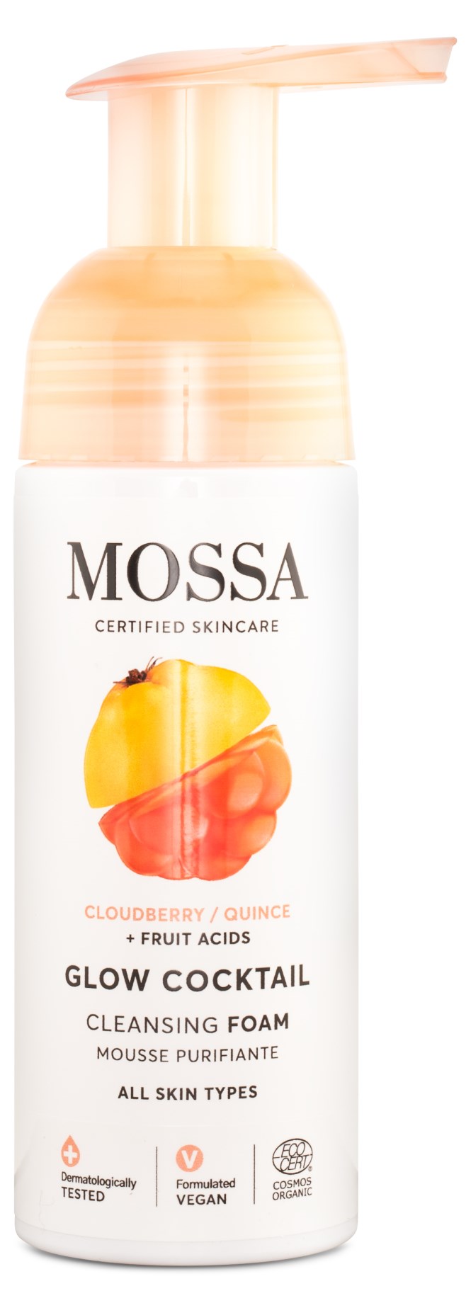 Rengör huden och ge den lyster med Mossa Glow Cocktail Cleansing Foam, ett rengöringsskum som skonsamt tar bort smink och orenheter. Med vitamin- och fruktsyrarika extrakt av kvitten och hjortron som jämnar ut din hudton samt återställer hudens lyster. Perfekt för dig som vill boosta trött hud!