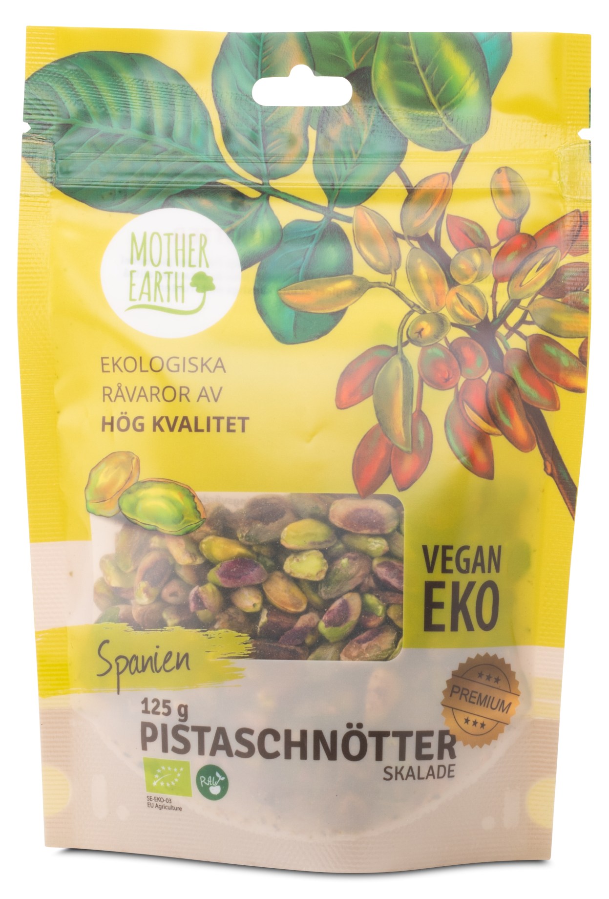 Pistaschnötter Premium Raw & Eko från Mother Earth är skalade pistagenötter (Pistacia vera). Rostade och saltade för extra god smak. Trots att fröet kallas pistagemandel eller pistagenöt som livsmedel, är det botaniskt sett ingen nöt. Därför är många personer med nötallergi oftast inte känsliga mot pistagefrukten. Perfekt att använda som topping eller att äta som de är, som ett gott snacks!
