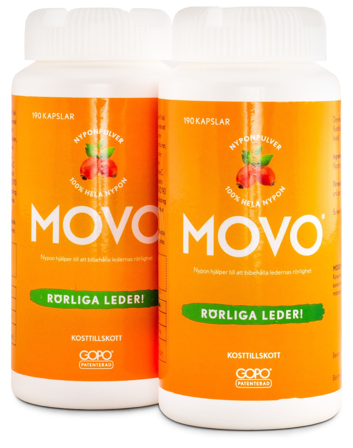 MOVO nyponkapslar i dubbelpack innehåller rent nyponpulver och har ett rikt innehåll av verksamma ämnen som är nyttiga för kroppen. Bland annat så är nyponpulver en naturlig produkt som blivit populär för att främja ledhälsa. Nypon i sig har dessutom ett högt naturligt innehåll av vitamin C. Nyponpulvret i kapslarna framställs varsamt genom en patenterad torkningsprocess som kallas GOPO®. Använd MOVO kapslar dagligen för att bibehålla naturlig rörlighet i lederna.