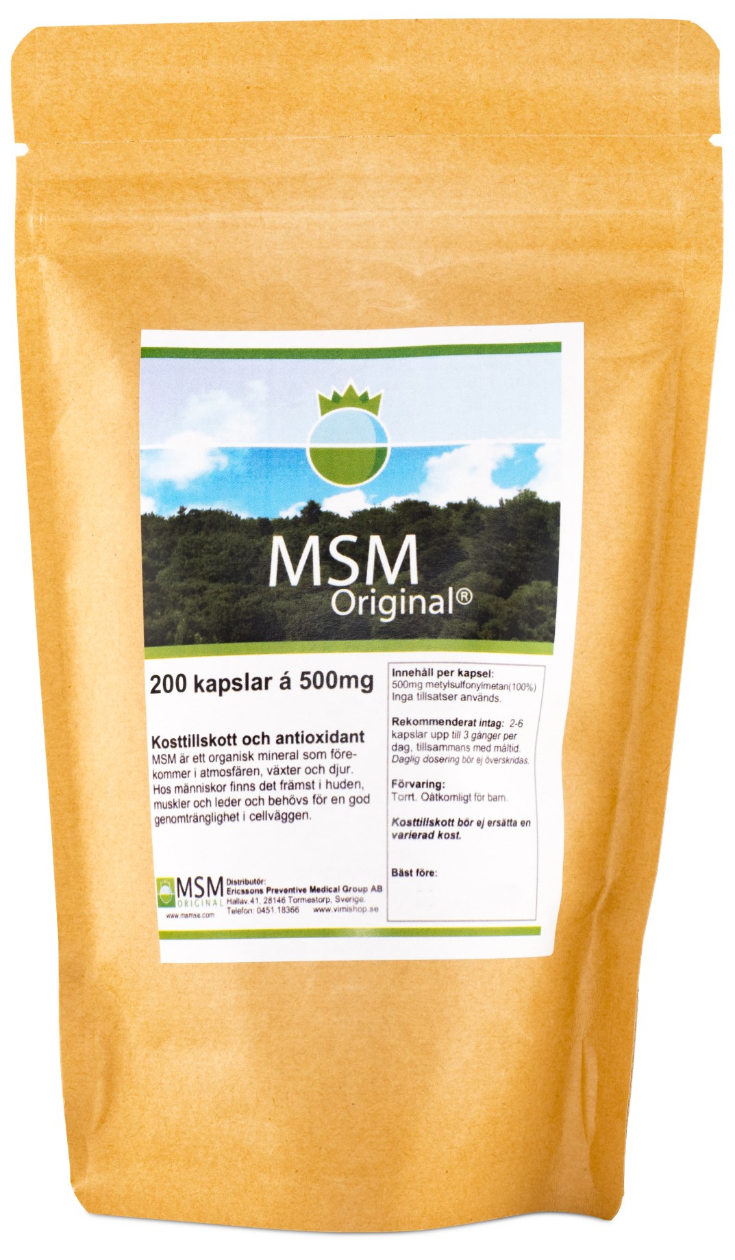 MSM Original Kapslar innehåller 100 % ren Metyl-Sulfonyl-Metan som är ett ämne som förekommer naturligt i våra celler. MSM kan användas oavsett ålder och kön och används för att bland annat stärka hud, hår och naglar. MSM är en kraftfull antioxidant som motverkar fria radikaler i kroppen och stödjer muskler och leder.