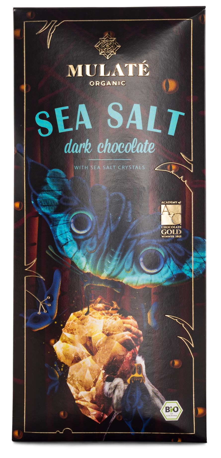 Mulate Dark Chocolate Eko Sea Salt är en len choklad toppad med havssalt. Chokladen har en tydlig men tillfredsställande salt smak som är en god kontrast till sötman i chokladen.