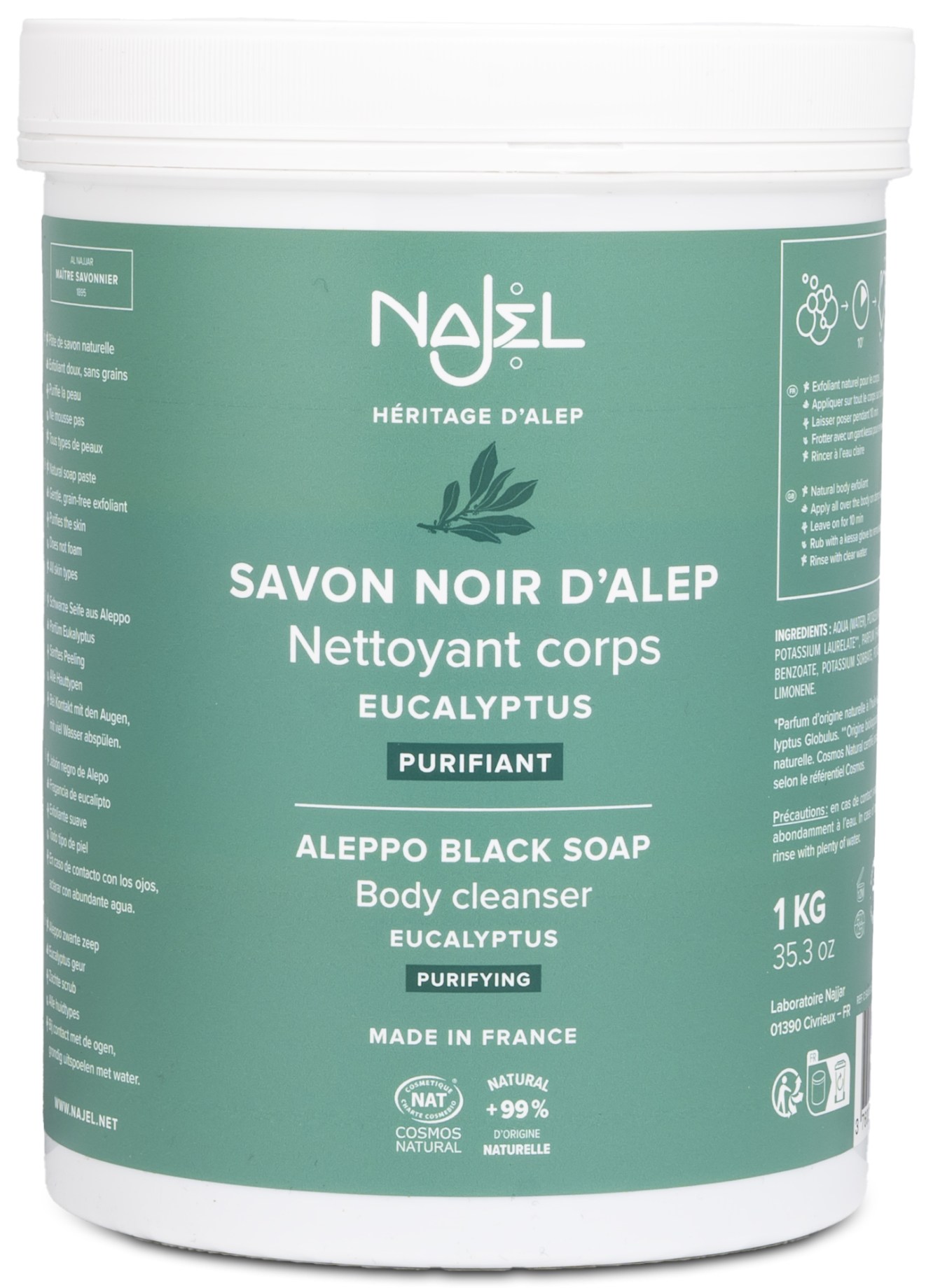 Najel Black Aleppo Soap är en svart aleppotvål, tillverkad av ekologisk jungfruolivolja och lagerbär för en naturlig och skonsam rengöring. Den exfolierande tvålen är kornfri och skonsam mot huden, passande för alla hudtyper. Berikad med eterisk Eukalyptus globulus-olja för en fräsch doft och uppfriskande känsla. Använd som den är eller tillsammans med en skrubbhandske eller svamp för att exfoliera huden på djupet.