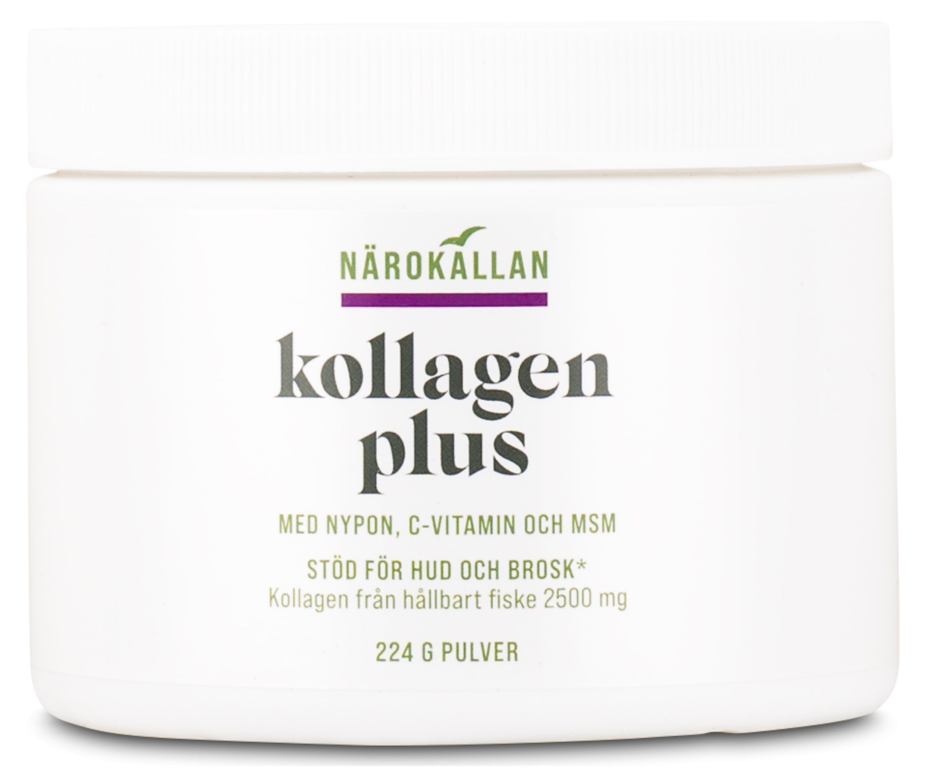 Kollagen Plus från Närokällan är ett kollagenpulver med extra näring från flera verksamma ämnen: nypon, MSM, hyaluronsyra, gurkmeja med mera. Alla dessa näringsämnen är starkt förknippade med kosttillskott för leder, men även för hud och naglar. Kollagen Plus innehåller fiskkollagen från Alaska Pollock, från hållbara fiskbestånd i Nordamerika.