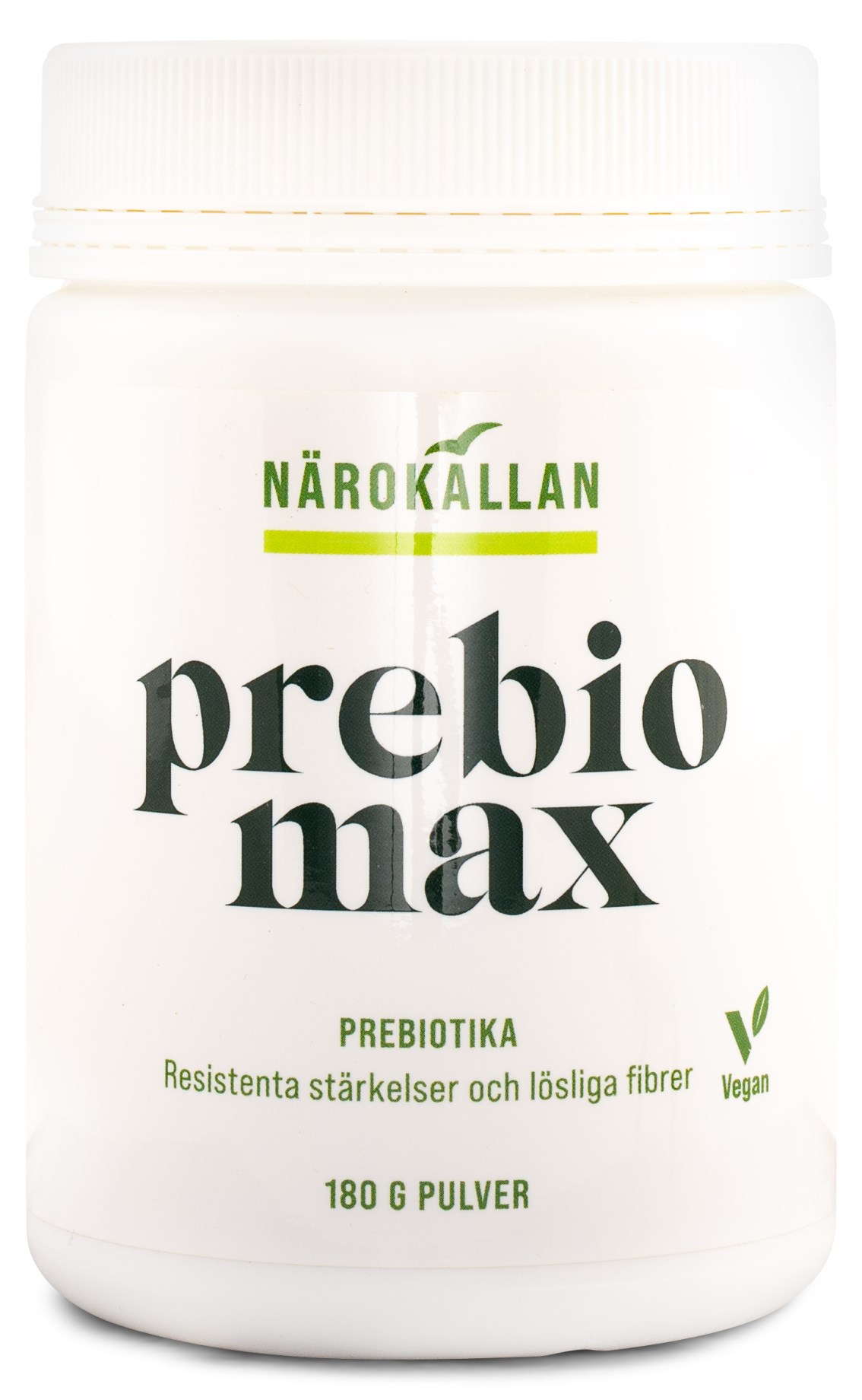 Närokällan PrebioMax är ett pulver med naturliga fibrer från bland annat agave, acacia, cikoria och grön banan. Denna fibertyp kallas även prebiotika, och fungerar som näring till våra egna bakterier i tarmfloran (probiotika). Prebiotika är hållbart och levnadskraftigt genom mag-tarmkanalen och bryts inte ned utan verkar istället i tarmarna för en normal tarmfunktion. Magvänliga mjölksyrabakterier fungerar som en del av vårt immunsystem, som skyddar oss mot skadliga bakterier. Ibland kan den naturliga tarmfloran rubbas, och då kan prebiotika vara intressant för att gynna tarmfloran så att den tillåts frodas. Närokällan PrebioMax är ett pulver som du kan blanda i vätska eller strö över maten. 1 matsked på 6 gram är en lagom daglig dos. PrebioMax är 100 % naturligt och fritt från tillsatsämnen.