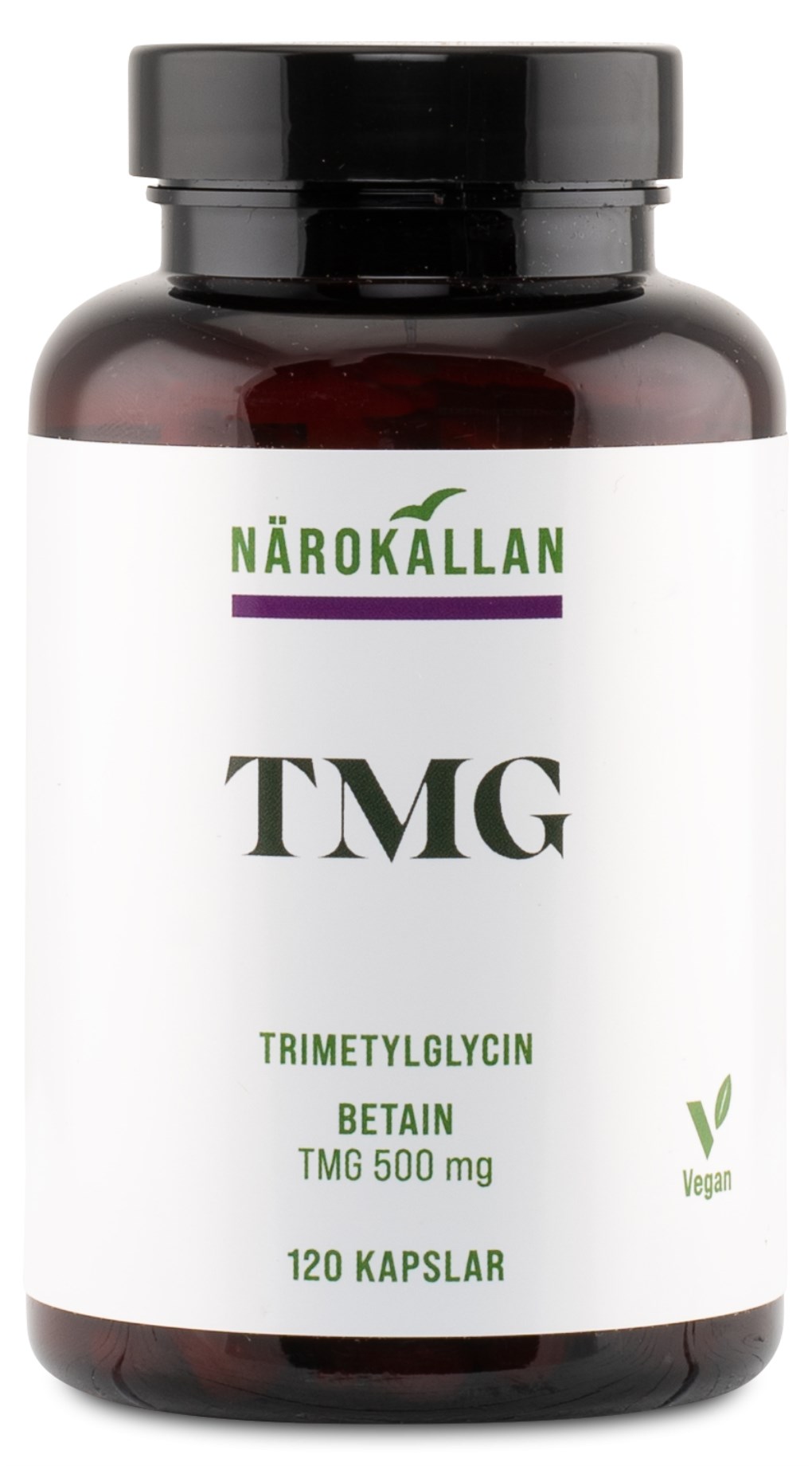 Närokällan TMG är ett kosttillskott som innehåller TMG, även kallat trimetylglycin och betain. TMG är en förening som kroppen naturligt kan producera och som även finns i olika livsmedel såsom vetegroddar och spenat. Närokällan TMG är dessutom berikad med aminosyran leucin. En kapsel innehåller 500 mg TMG.