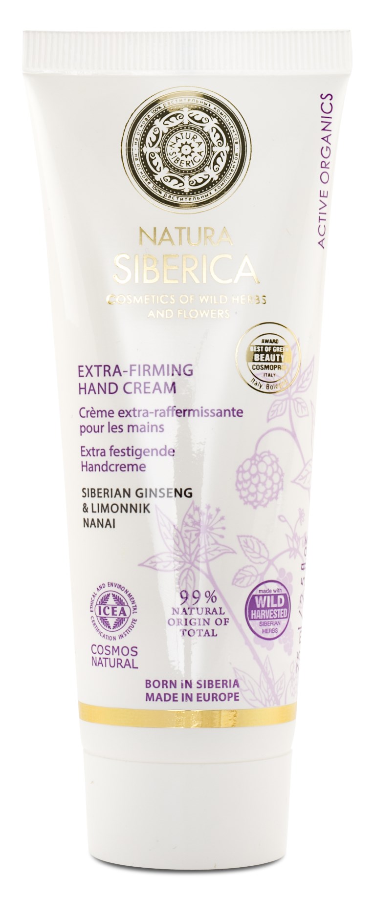 Extra-Firming Hand Cream från Natura Siberica är en lyxig och näringsgivande handkräm som mjukgör och återfuktar på djupet. Dina torra händer känns smidigare och fastare tack vare Limonnik Nanai, som bidrar med C- och E-vitamin. Krämen innehåller även sibirisk ginseng och extrakt av sibirisk rönn som ger näring, lugnar huden och motverkar uttorkning.