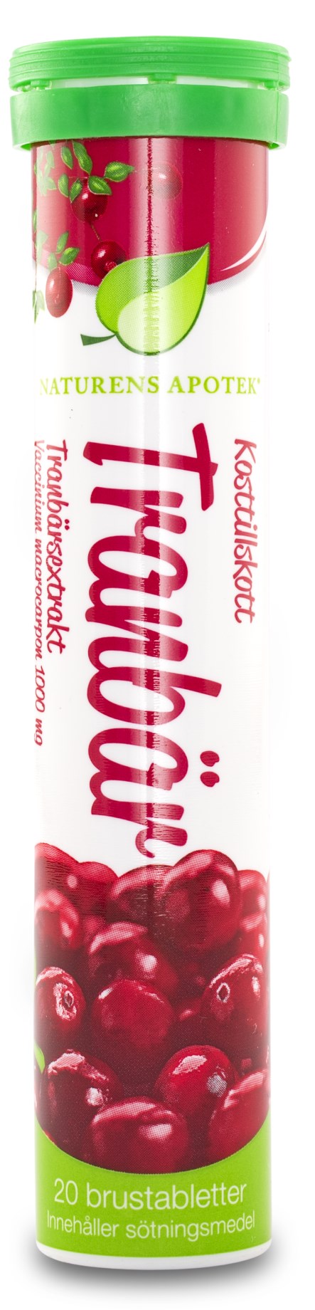 Tranbär i praktisk brustablett, löses upp i vatten till en välsmakande dryck. Tranbär är ett bär som växer i den svenska marken och de har länge använts som naturmedel.