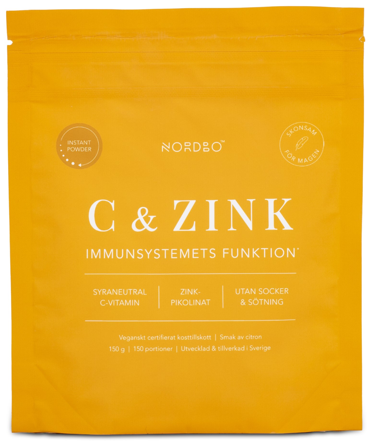 Upptäck C & Zink Instant Powder från Nordbo, ett lättlösligt pulver med den ultimata kombinationen av vitamin C och Zink. Med syraneutralt C-vitamin som är skonsamt mot magen och med längre halveringstid i kroppen, samt zink från zinkpikolinat med hög biotillgänglighet. Båda dessa näringsämnen bidrar till immunsystemets normala funktion. Pulvret är lätt att blanda i valfri kall dryck, har en lätt smak av citron och är fritt från andra tillsatser och sötning. Precis som Nordbos övriga sortiment är denna produkt tillverkad i Sverige, är helt vegansk och certifierad av Djurens Rätt.