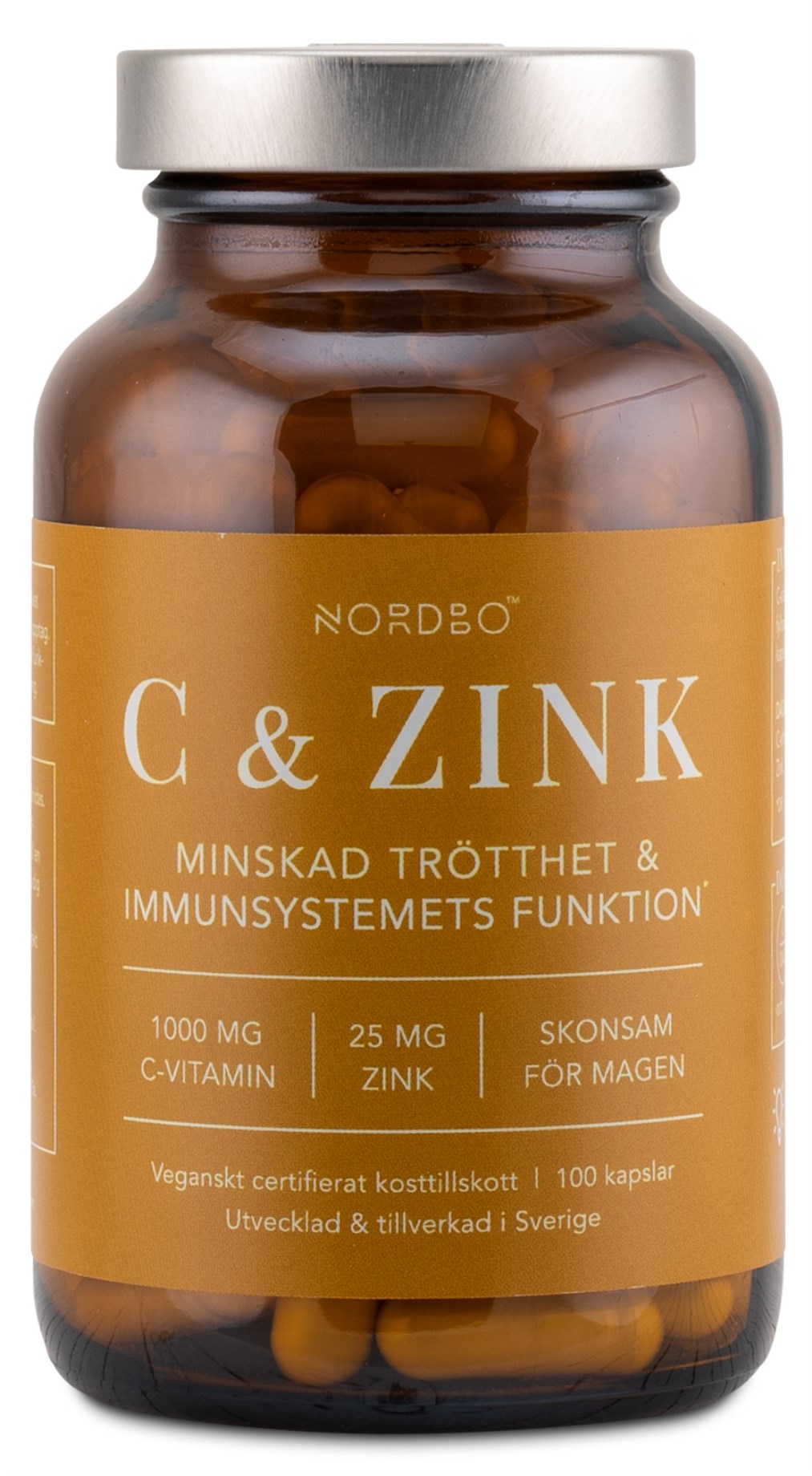 Nordbo C-vitamin & Zink är ett kosttillskott med C-vitamin och zink i lättupptagliga former. Tillskottet innehåller syraneutral och högdoserad C-vitamin i form av kalciumaskorbat, som både är biotillgängligt och skonsamt för magen. Zinket är i form av zinkpikolinat, vilket är en form som är extra lätt för kroppen att ta upp. Både C-vitamin och zink bidrar till immunsystemets normala funktion, till att bibehålla normal benstomme samt till att skydda cellerna mot oxidativ stress. Nordbo C-vitamin & Zink är svensktillverkad, vegansk samt godkänd av Djurens Rätt.
