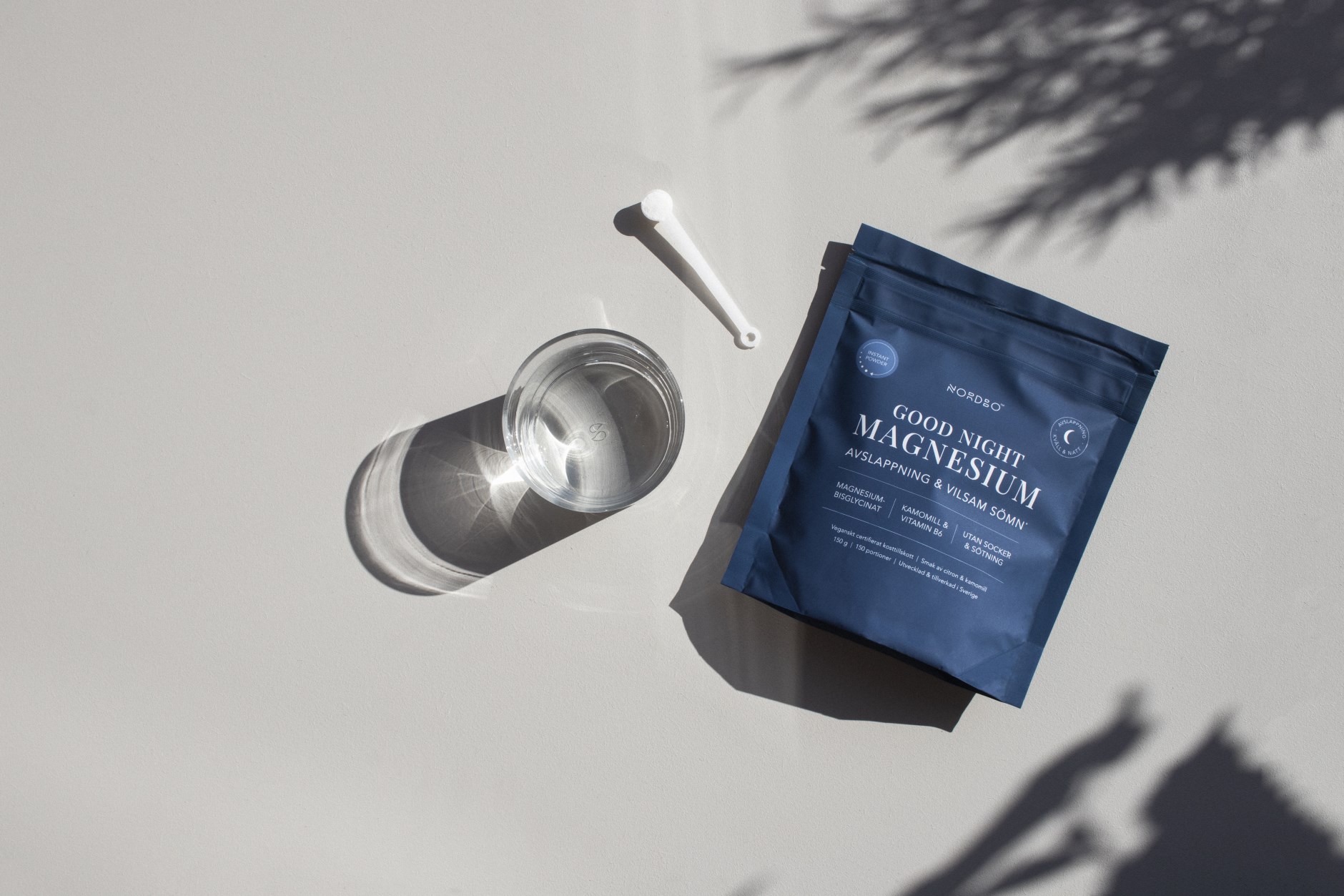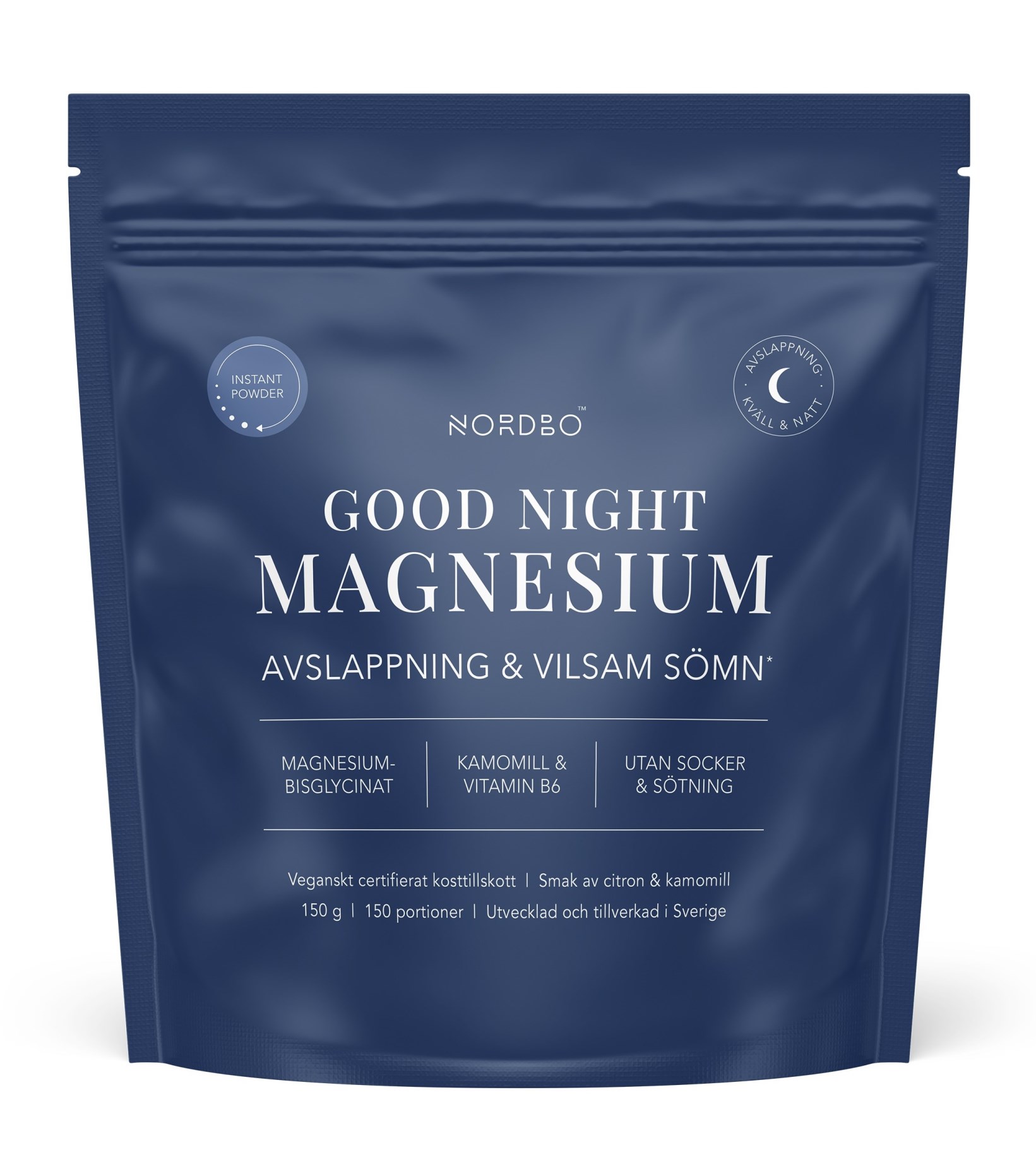 Avsluta dagen med ett glas Good Night Magnesium Instant Powder från Nordbo, ett magnesiumpulver speciellt för kvällen. Det innehåller magnesiumbisglycinat med hög biotillgänglighet och som är skonsamt för magen. Magnesium bidrar till normal nerv- och muskelfunktion, där det bland annat är involverat i musklernas förmåga till avslappning. Dessutom innehåller det vitamin B6 som bidrar till normal psykologisk förmåga, samt kamomillextrakt. Pulvret löser sig lätt i vatten och har en god smak av citron och kamomill, helt utan andra tillsatser eller sötning. Tillverkad i Sverige och certifierad som vegansk av organisationen Djurens Rätt.
