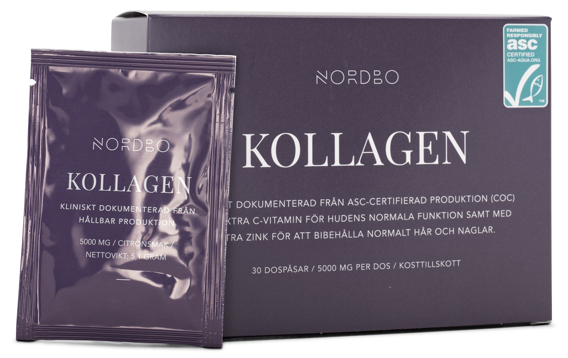 Nordbo Kollagen är ett kollagentillskott i pulverform som enkelt löses upp och blandas i valfri vätska. Kollagenet kommer från fisk och är ASC-certifierat vilket garanterar att produktionen är hållbar både socialt och miljömässigt. Kollagenproteinet bidrar till hudens elasticitet samt stärker kvaliteten på hår och naglar. Med stigande ålder avtar den naturliga kollagenproduktionen i våra kroppar och kan därmed vara en anledning till att rynkor och fina linjer uppkommer. Vitamin C och zink är tillsatt för att öka upptaget av kollagen i kroppen. Nordbo Kollagen kommer i praktiska doseringspåsar med en god och naturlig smak av citron.