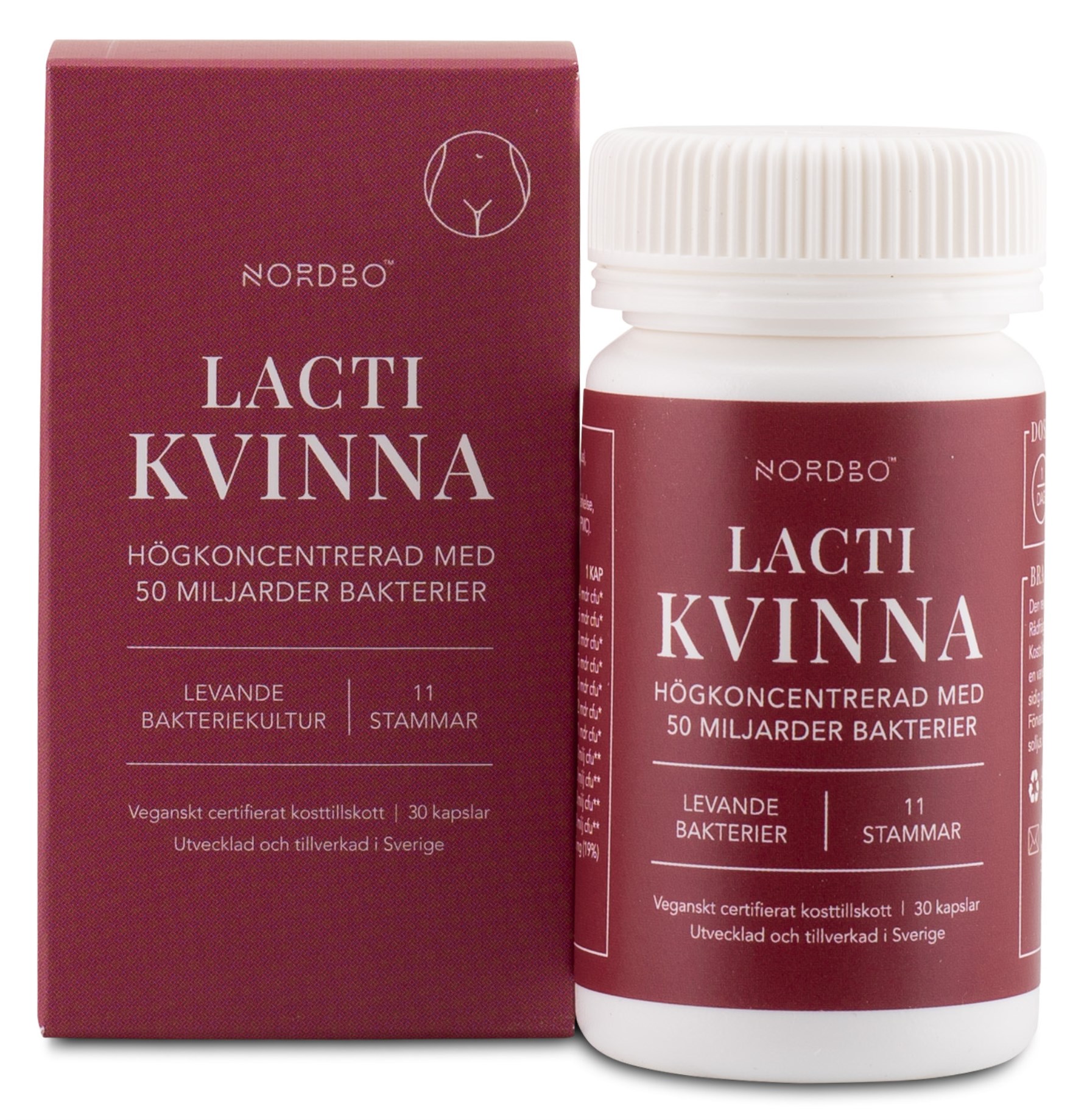 Nordbo LactiKvinna är ett kosttillskott med mjölksyrabakterier, speciellt framtaget för att stödja kvinnors allmänna och vaginala hälsa. Detta tillskott innehåller hela 50 miljarder mjölksyrabakterier från 11 olika stammar, varav hela 90 % Lactobacillus-bakterier. Det innehåller även syraneutralt C-vitamin som är snällt mot magen och bidrar till immunsystemets normala funktion. Nordbo LactiKvinna är fritt från laktos, mjölk och gluten samt certifierat med I’m Vegan av Djurens Rätt.