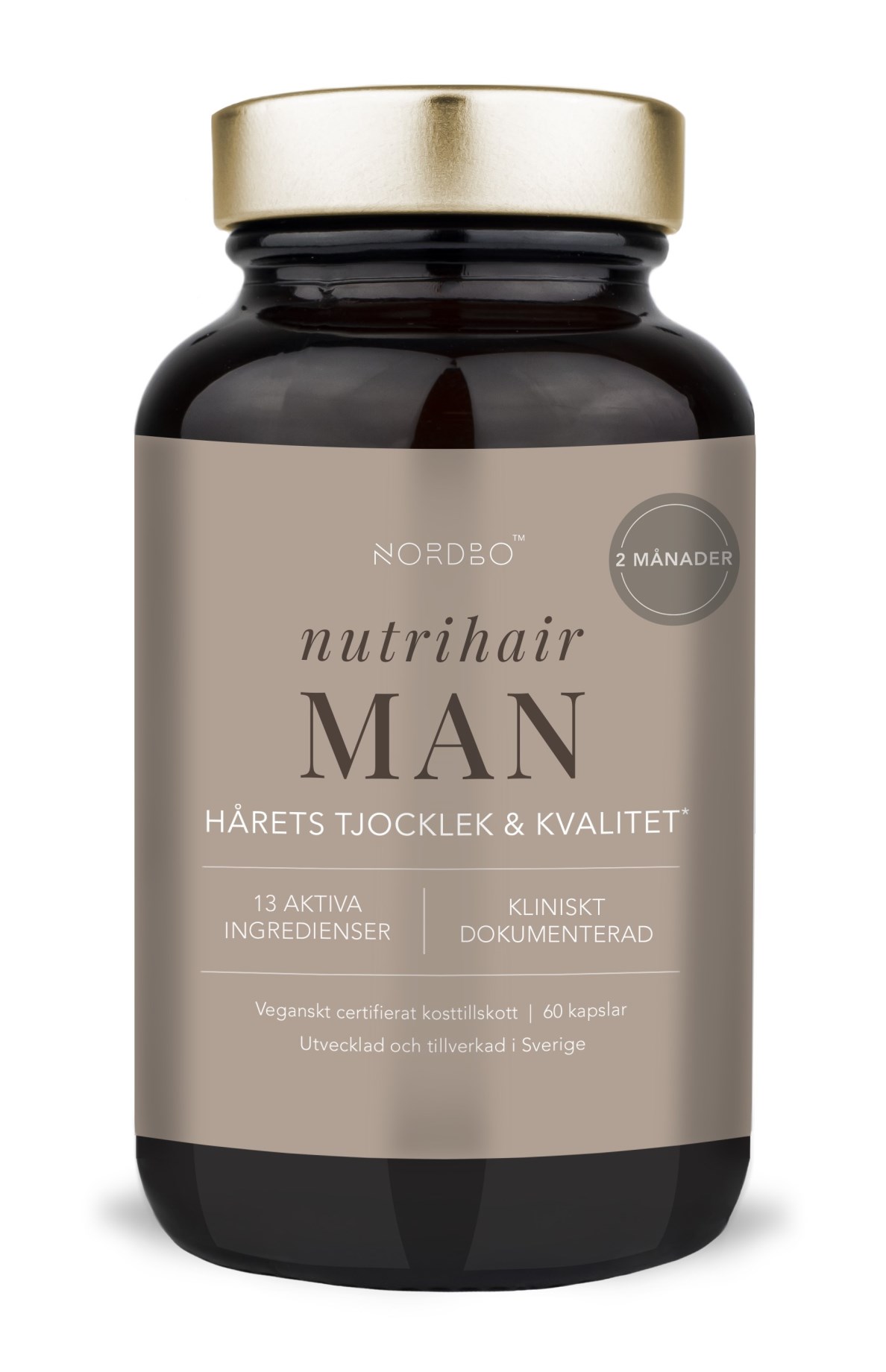 Nordbo Nutrihair Man är ett tillskott för män som vill vårda sitt hår inifrån. Nutrihair Man innehålle Actrisave™, ett synergistiskt komplex av svart ris och fikonkaktusblomma, som utvärderats i en studie från maj 2023 där deltagarna rapporterade positiva effekter på hårkvalitet och håravfall. Kosttillskott innehåller även bland annat macarot, granatäpple, pumpafröextrakt, kamomill, L-cystein och bambu, som alla arbetar för att ge håret en riktigt boost. Bambu innehåller dessutom kisel, som bidrar till normal kvalitet på hår, hud och naglar och är populärt inom tillskott för hårhälsa.
