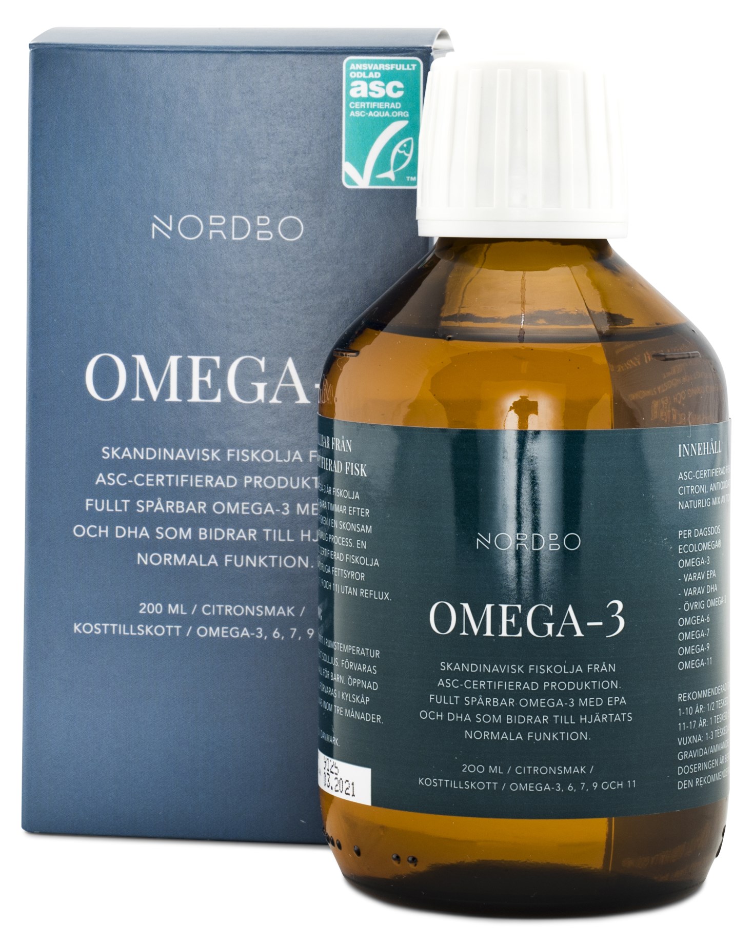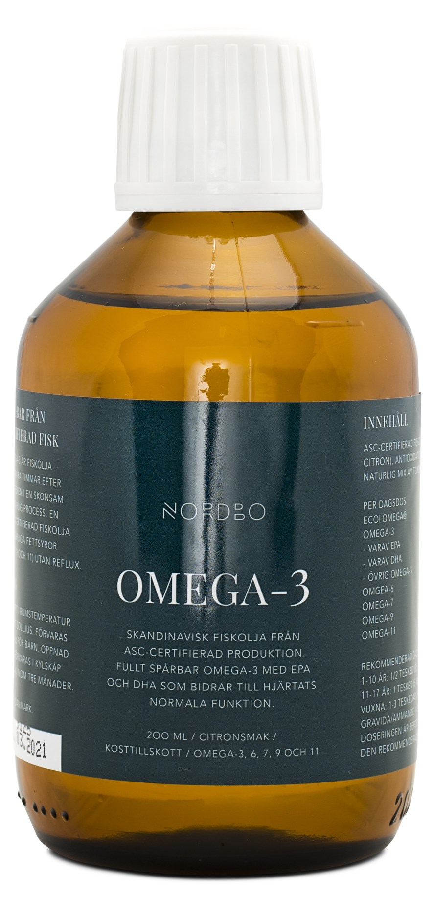 Nordbo Omega-3 innehåller rikligt med både enkelomättade och fleromättade fettsyror. Fiskoljan är ASC-certifierad och kommer från öring fiskad i Danmark som säkerställer en hållbar, miljövänlig och spårbar produktion. För att bibehålla en normal hjärt- och kärlhälsa är det viktigt att få i sig EPA och DHA som är viktiga omega-3-fetter. Nordbo Omega-3 innehåller dessutom omega-6, -7, -9 och -11 som alla är viktiga för att upprätthålla normalhälsan, bland annat för kroppens slemhinnor och motverka hjärt- och kärlsjukdom. Välj mellan kapslar eller fiskolja i flytande form med smak av citron.