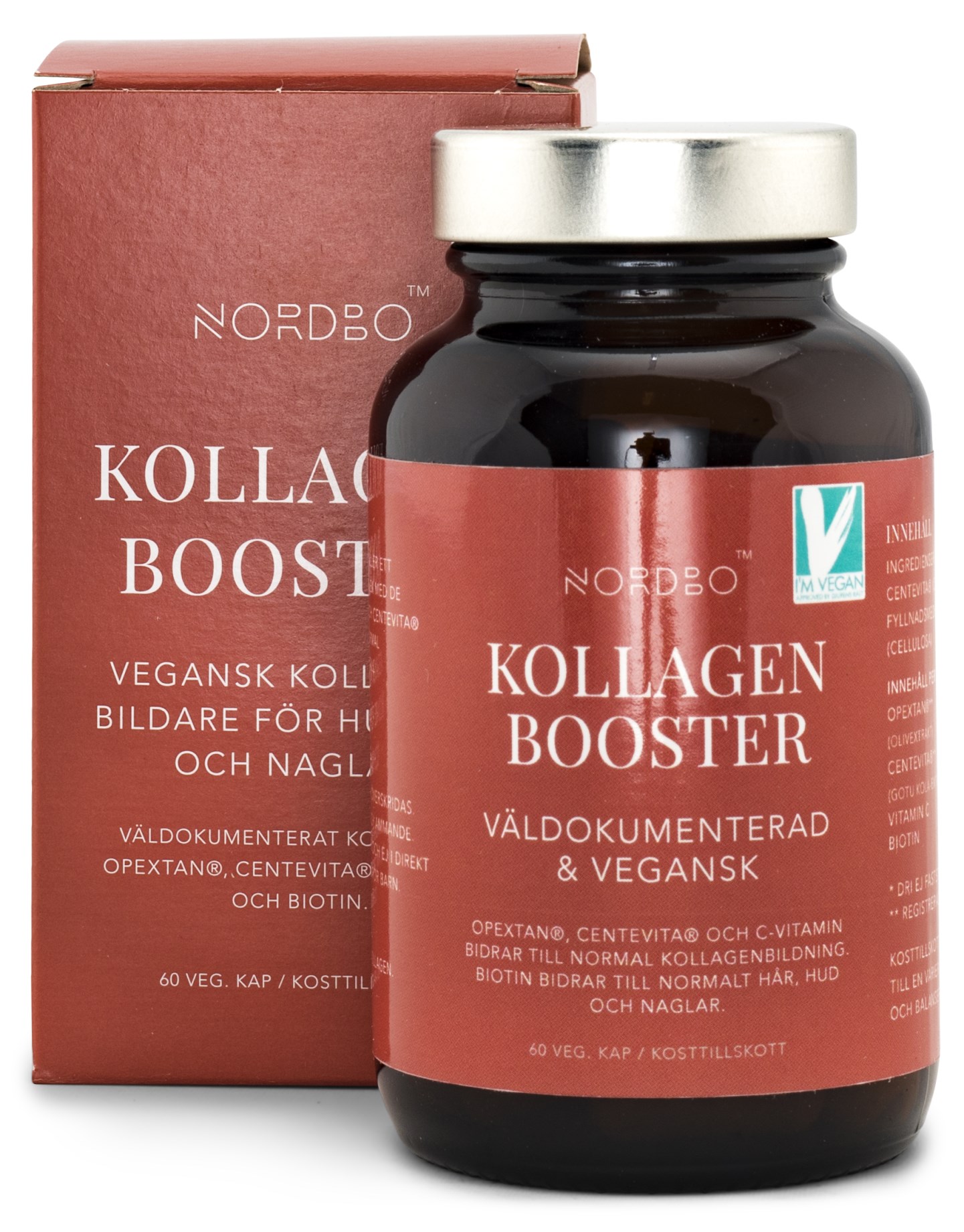 Nordbo Vegan Kollagen Booster är ett tillskott som innehåller ett komplex av de unika växtextrakten Opextan® och Centevita® och även C-vitamin som bidrar till en normal kollagenbildning. Kollagen upprätthåller leder, naglar och hår och underlättar för huden att hålla sig mjuk.