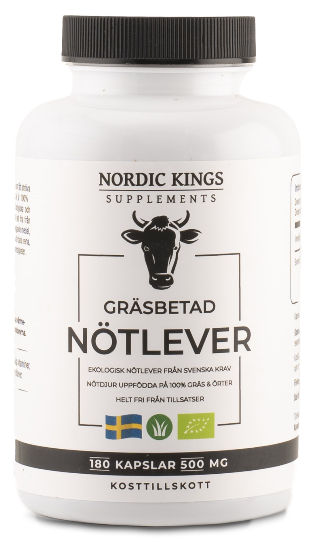 Nordic Kings Gräsbetad Nötlever EKO är kapslar med nötlever från gräsbetande, svenska nötdjur. Djuren är uppfödda på mat av 100 % gräs och örter, utan tillskott av spannmålsfoder som soja, vete eller majs. Nötlevern frystorkas varsamt för att bevara dess höga näringsinnehåll och är fri från antibiotika, tillväxthormoner och bekämpningsmedel. Lever är en utmärkt källa till A-vitamin i formen retinol, samt CoQ10, hemjärn, vitamin B12, kolin, folat och flera viktiga kofaktorer. Tillskottet är allergenfritt och innehåller inga tillsatser, utfyllnadsmedel eller bindemedel – endast näringsrik frystorkad nötlever.