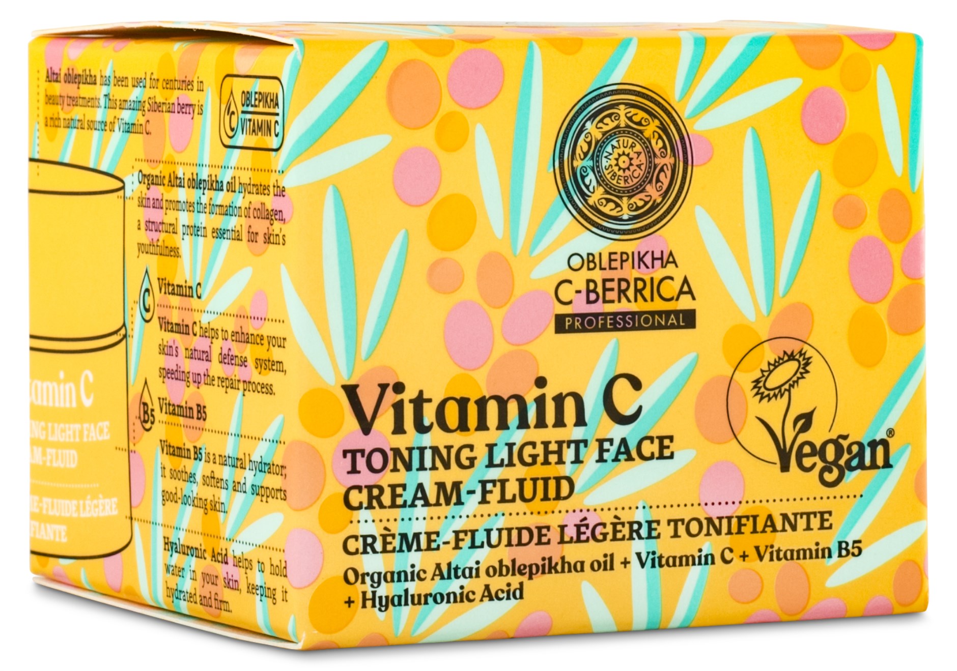 Oblepikha C-Berrica Toning Light Face Cream-Fluid från Natura Siberica är en härlig ansiktskräm som ger din hud energi och skyddar den mot skadlig påverkan utifrån. Ger din hud en fräsch och smidig känsla. Krämen innehåller bland annat vitamin C, havtorn och hyaluronsyra. Den ger huden återfuktning och stärker dess naturliga skydd. Krämen är vegansk och ekologisk.