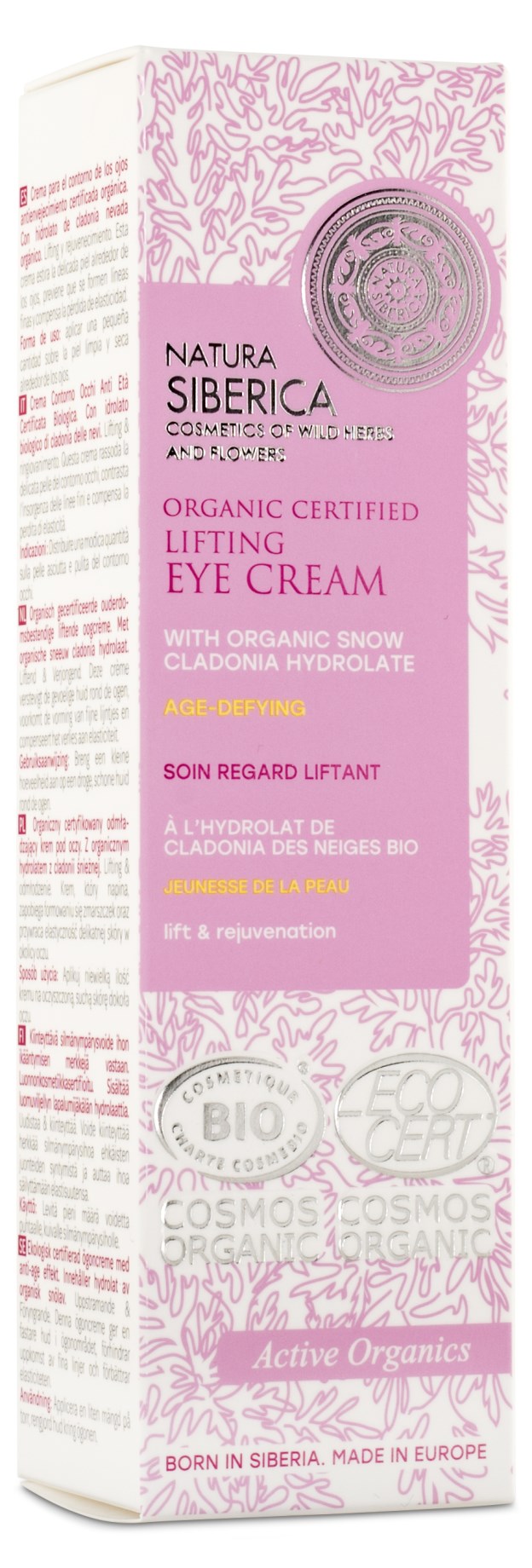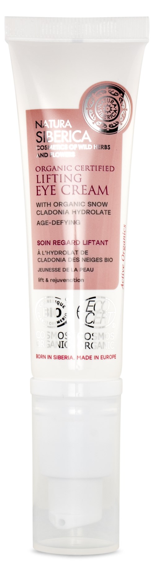 Organic Certified Age-Defying Lifting Eye Cream från Natura Siberica är en ögonkräm som tar hand om den känsliga huden runt ögonen samtidigt som den bidrar till att minska fina linjer. Krämen har en bas av naturliga och ekologiska ingredienser som växten cladonia, hyaluronsyra, sibirisk tallolja och vitamin E. Dessa ingredienser återfuktar på djupet och ger ökad elasticitet och lyster. Använd dagligen för bästa resultat.