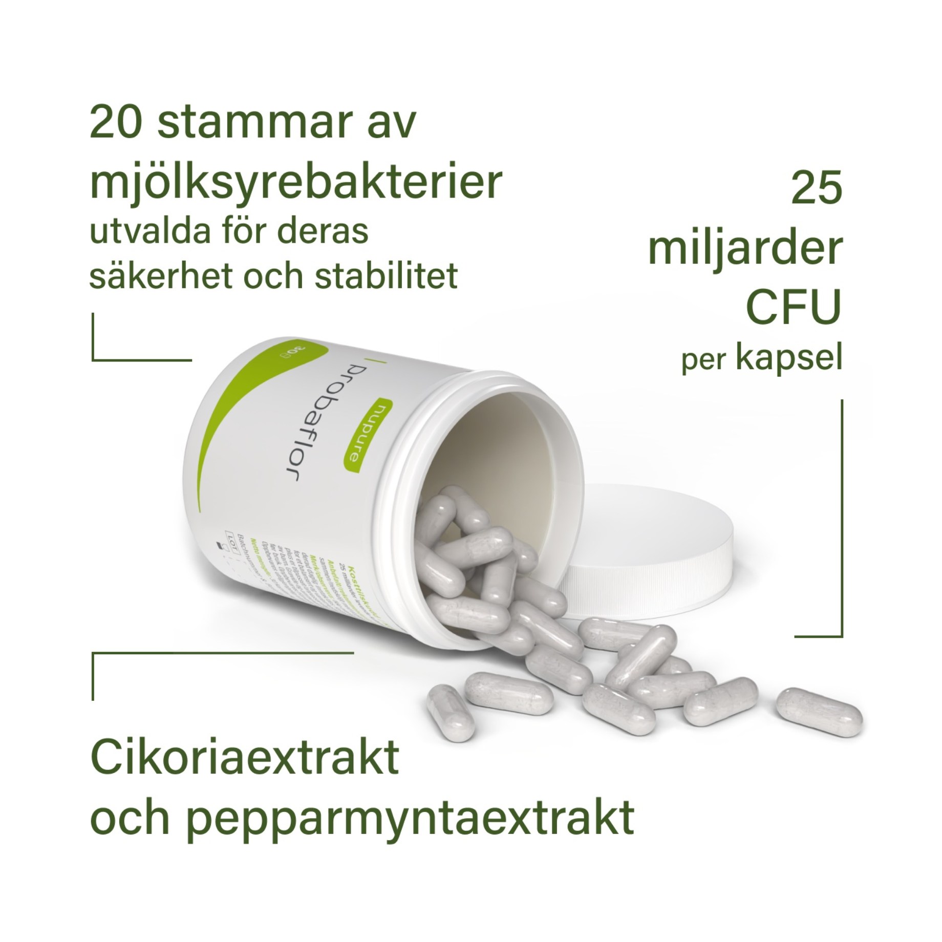Nupure Probaflor är ett kosttillskott med goda bakterier från 20 olika bakteriestammar. Mjölksyrastammarna är utvecklade för att trivas över ett brett pH-intervall, och i varje kapsel finns det 25 miljarder CFU som är anpassade för att stödja det naturliga tarmmikrobiomet i kroppen. Probaflor innehåller även inulin – en prebiotisk fiber som stödjer tillväxten av nyttiga tarmbakterier. Probaflor produceras enligt högsta EU-standarder och genomgår noggranna tester för att säkerställa både renhet och hög styrka. Formuleringen är frystorkad för att bevara bakteriernas stabilitet och förlänga hållbarheten.