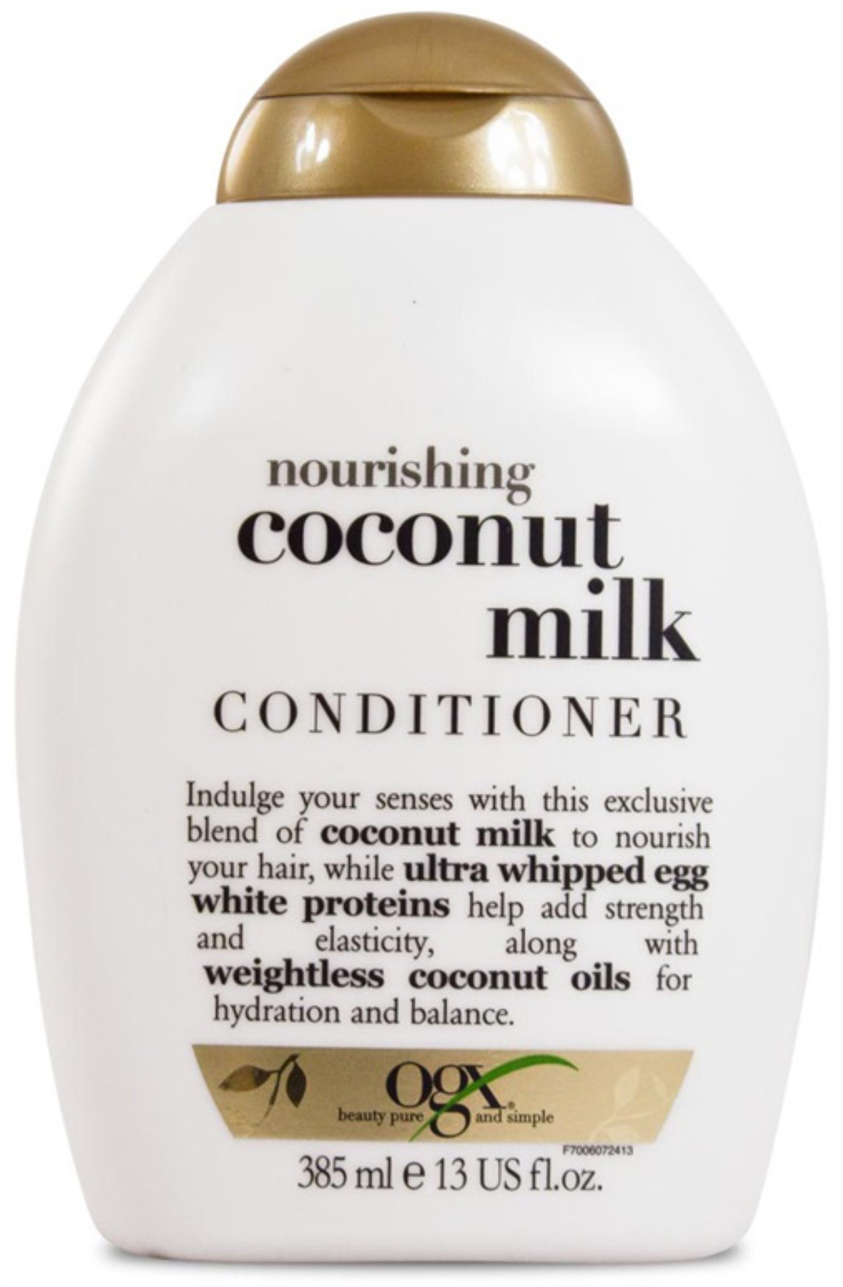 OGX Coconut Milk Conditioner är ett väldoftande balsam som passar alla hårtyper. Det härliga balsamet ger en extra mjuk effekt till håret och gör det lätt att reda ut med kam. Detta balsam innehåller noga utvalda oljor och extrakt från naturen, som ger vård och näring på djupet. Bland annat ingår en kokosmjölk som vårdar på djupet och doftar ljuvligt. Använd gärna tillsammans med Coconut Milk Shampoo.