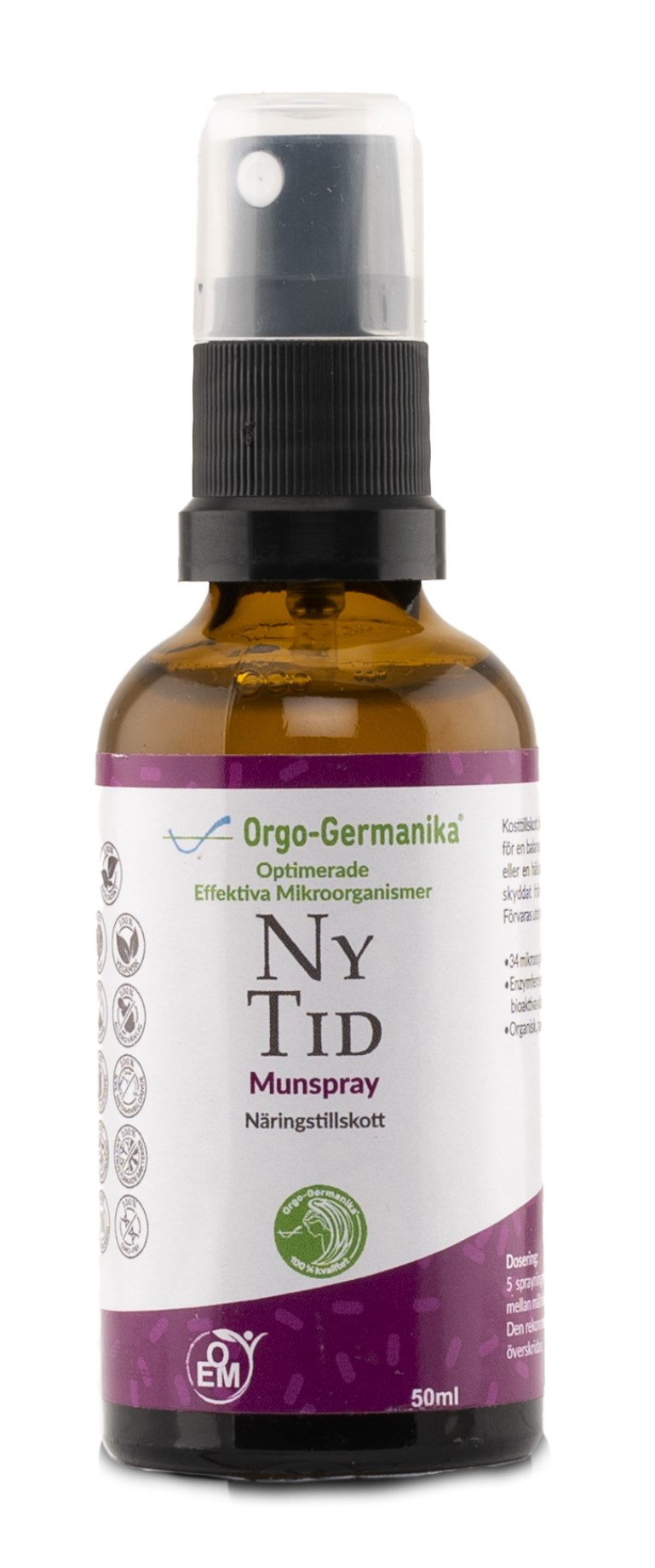 Munsprayen Ny Tid från Orgo-Germanika innehåller 34 stammar av mikroorganismer som kan hjälpa till att upprätthålla en hälsosam bakteriebalans. Bakterierna i Ny Tid Munspray är noga utvalda samt GMO-fria (MicroVeda® Effektiva Mikroorganismer). Sprayen innehåller även enzymer, bioaktiva växtämnen, antioxidanter och vitaminer.