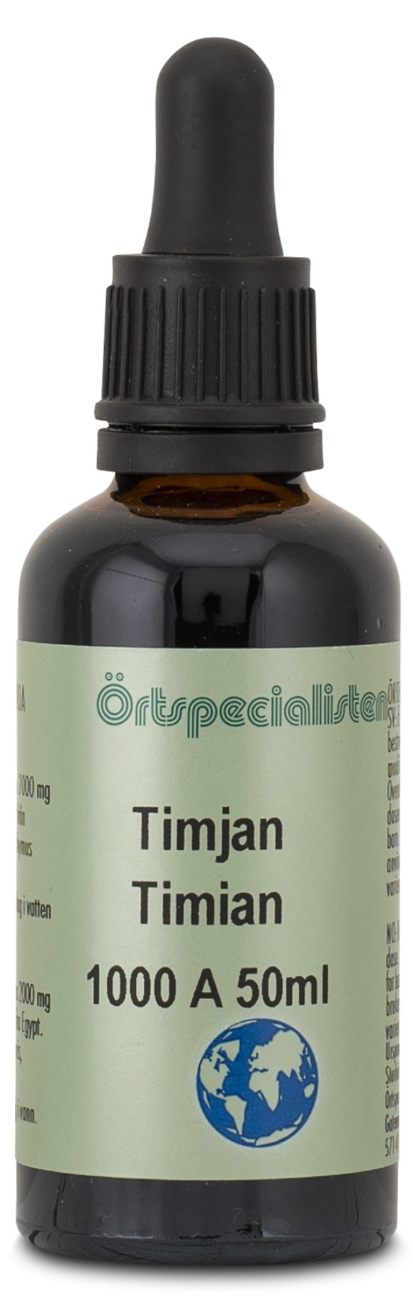 Örtspecialisten Timjan 1000A är ett flytande extrakt av timjan. Genom historien har timjan använts som läkeväxt vid bland annat hosta och problem med matsmältningen. 2 ml av Örtspecialisten Timjan innehåller extrakt från 2000 mg kryddtimjan (Thymus Vulgaris) av torkad ört från Polen. Blanda enkelt med vatten.