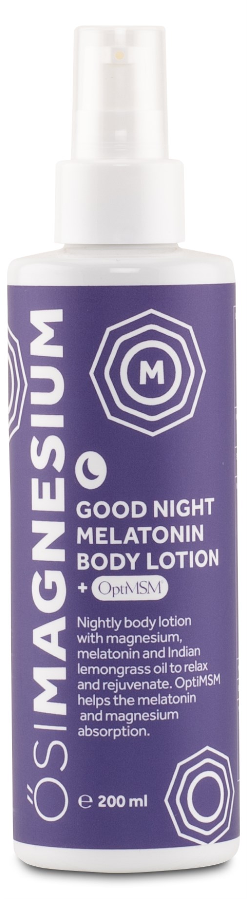 Magnesium bidrar till musklernas förmåga att slappna av samt till immunsystemet. MSM förekommer naturligt i all bindväv där det bidrar till kollagenets uppbyggnad samt för normala leder och muskler. Därför passar OsiMagnesium Goodnight Body Lotion + OptiMSM utmärkt att smörja in trötta muskler och stela leder med på kvällstid, så att ingredienserna får en möjlighet att verka både för kroppen och för sömnen.