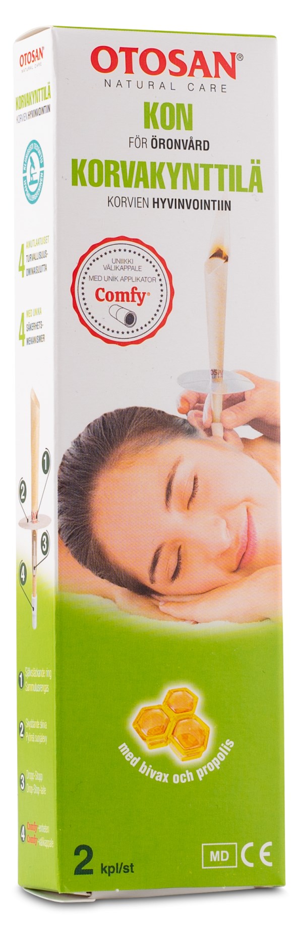 Med Otosan Öronljus kan du hålla dina öron rena på ett naturligt och säkert sätt. Öronljus är en urgammal behandlingsteknik som använts i många kulturer och civilisationer. Under behandlingen värms örats inre väggar och vaxet mjukas upp. Värmen gör att luften stiger, vilket skapar ett vakuum och ett sug vid konens bas. På så sätt transporteras vax, vätska och andra föroreningar ur ut örat och in i ljuset. Dessutom återställs trumhinnans korrekta spänning vilket hjälper om du har lock för örat. Otosan Öronljus är berikade med propolis som hjälper till att skydda och stärka det naturliga försvaret.