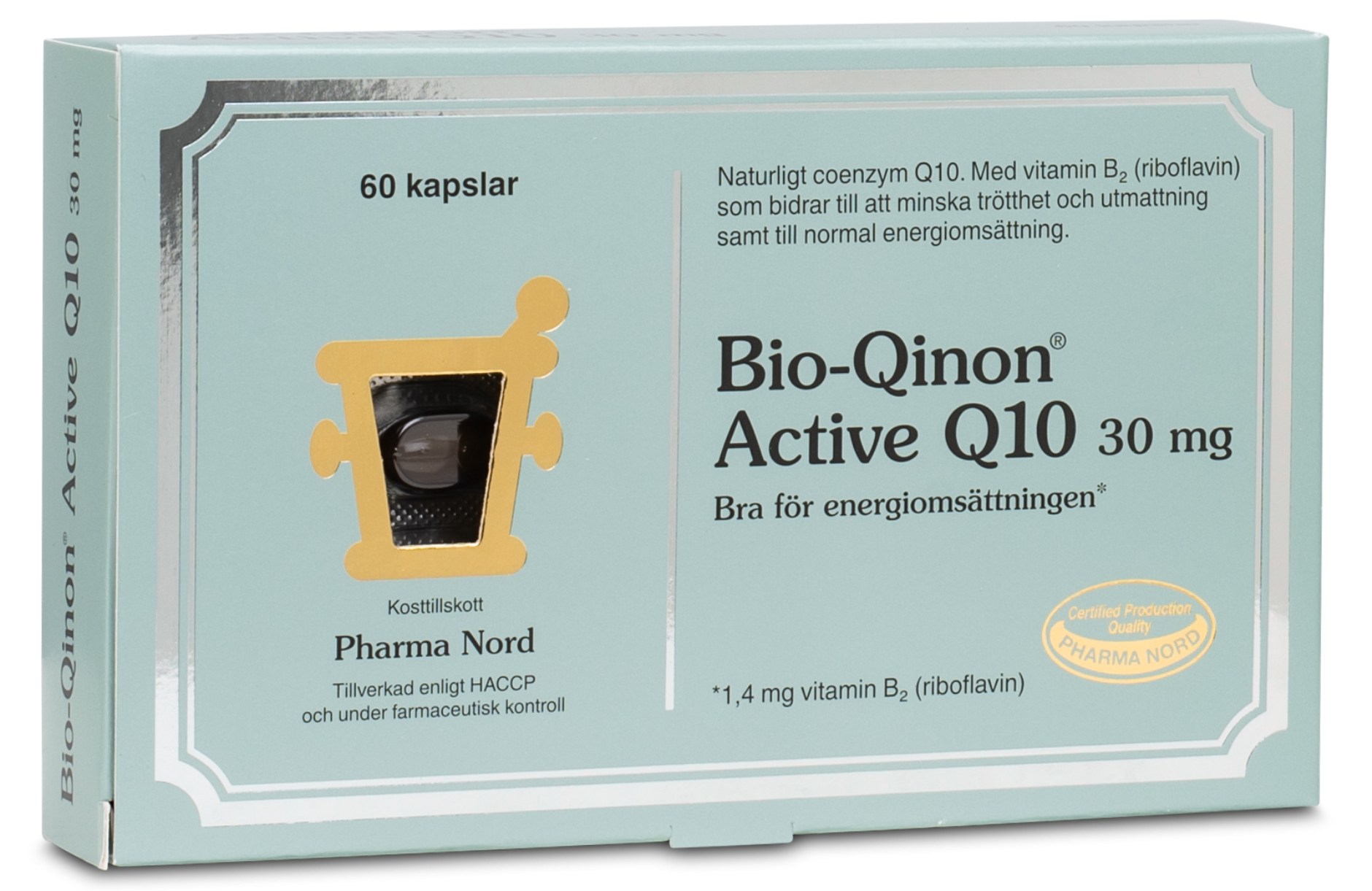 Bio-Qinon Q10 innehåller lättupptagliga kapslar av Q10 upplöst i vegetabilisk olja. Q10 är populärt som ett dagligt tillskott. Q10 är ett vitaminliknande ämne som lagras i musklernas mitokondrier där energi omsätts. Förutom att ingå i energiproduktionen, verkar även Q10 som antioxidant och skyddar cellerna mot oxidativ stress.