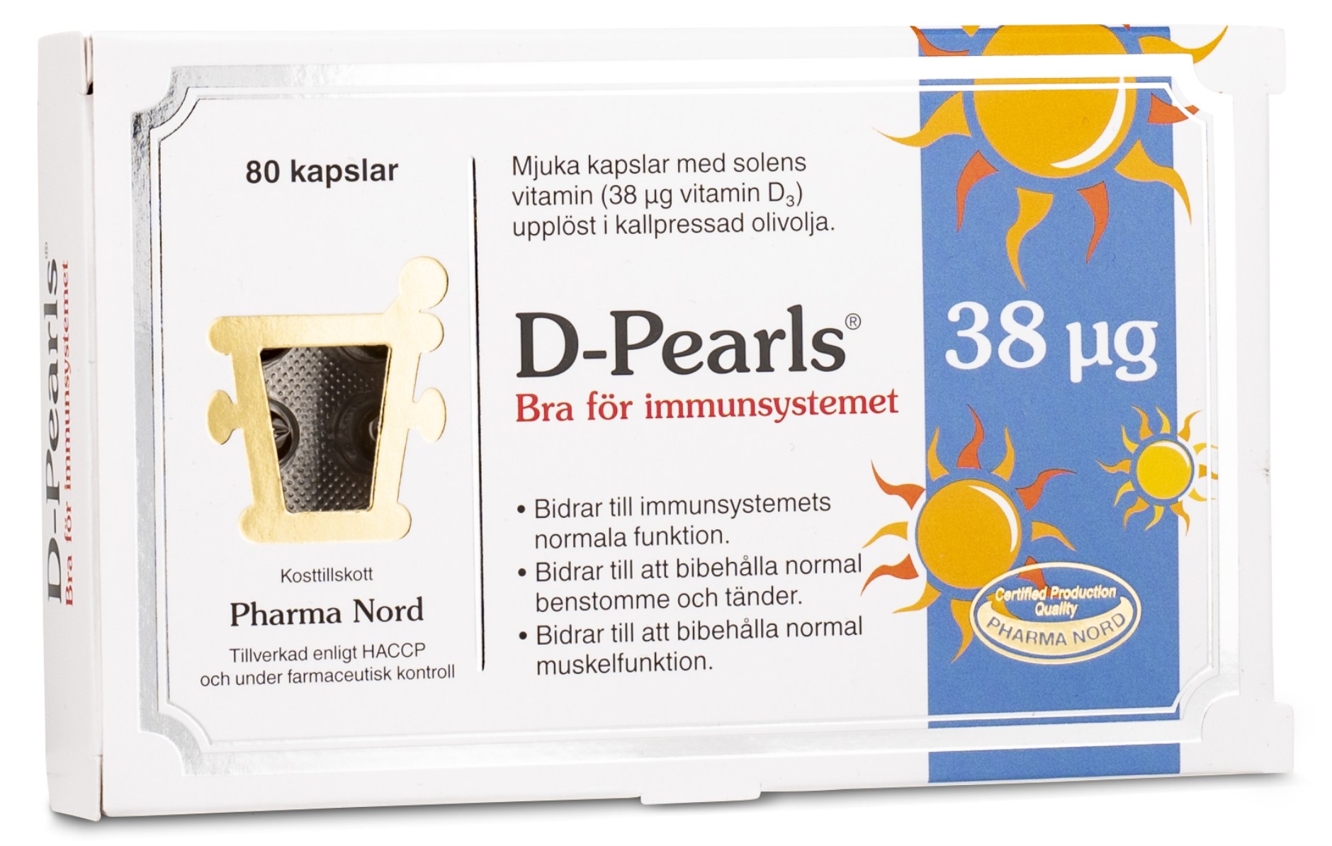 Vitamin D är ett fettlösligt vitamin som är viktig för bland annat ben, tänder och muskler. Den hjälper även till att stödja en normal celldelning och en normal funktion hos immunsystemet. D-Pearls VitaminD3 består av 38 mikrogram D-vitamin som är blandad med kallpressad olivolja för att förbättra absorptionen. Kapseln bör helst tas i samband med måltid då det underlättar upptaget av vitaminen.