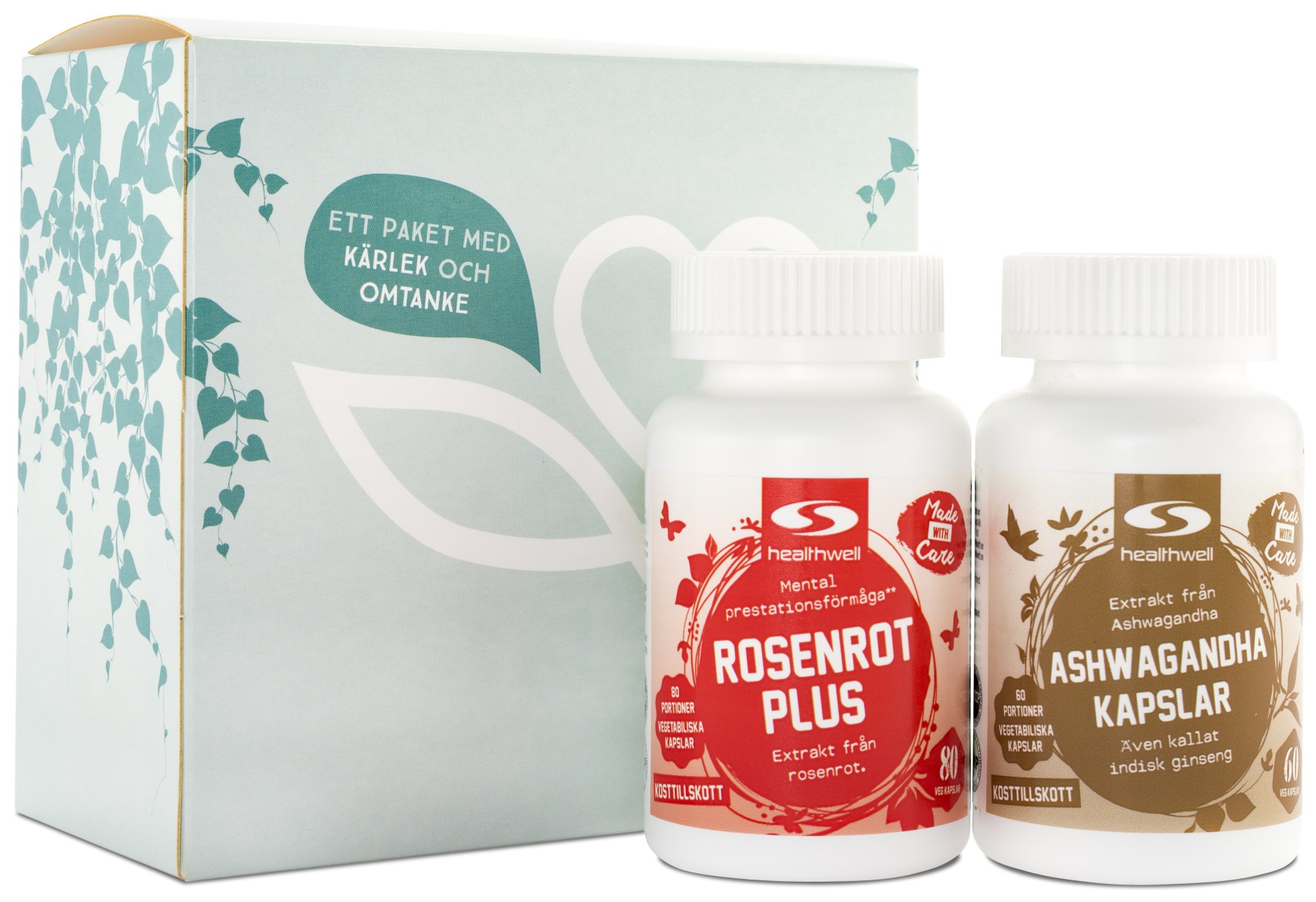 Healthwell Presentpaket Energi är ett presentpaket med två helt växtbaserade tillskott, Healthwell Ashwagandha Kapslar och Healthwell Rosenrot Plus. En perfekta gåva till någon i en stressig period eller till den som behöver mental fokus! Healthwells ashwagandha (även känd som "indisk ginseng") är ett högdoserat, rent extrakt från ashwagandharoten som kan tas vid perioder av stress, alternativt för mentalt samt fysiskt välbefinnande. Healthwells rosenrot är i sin tur ett starkt tillskott av rosenrot, ett ämne som bland annat studerats i samband med mental prestation och trötthet.