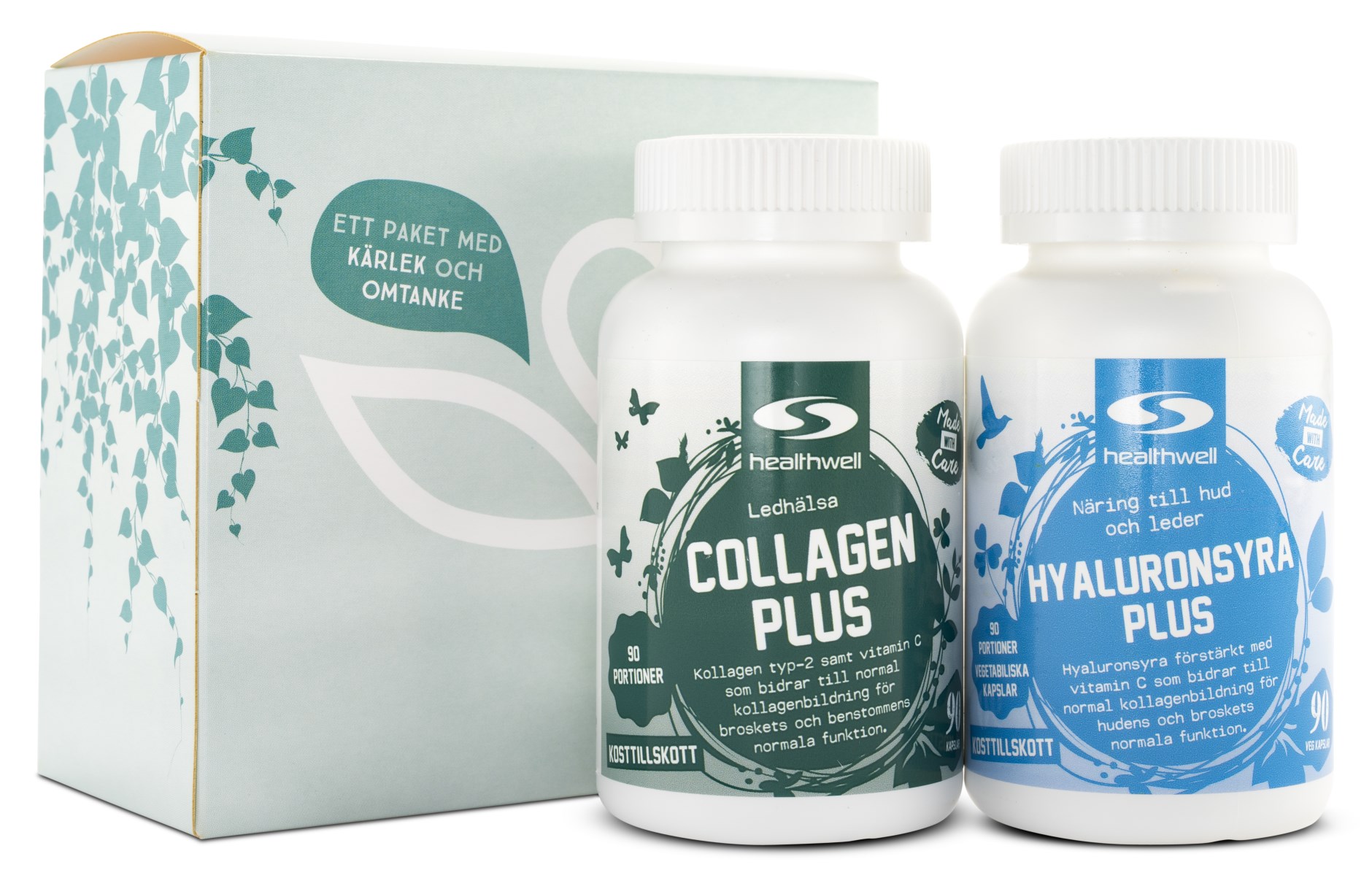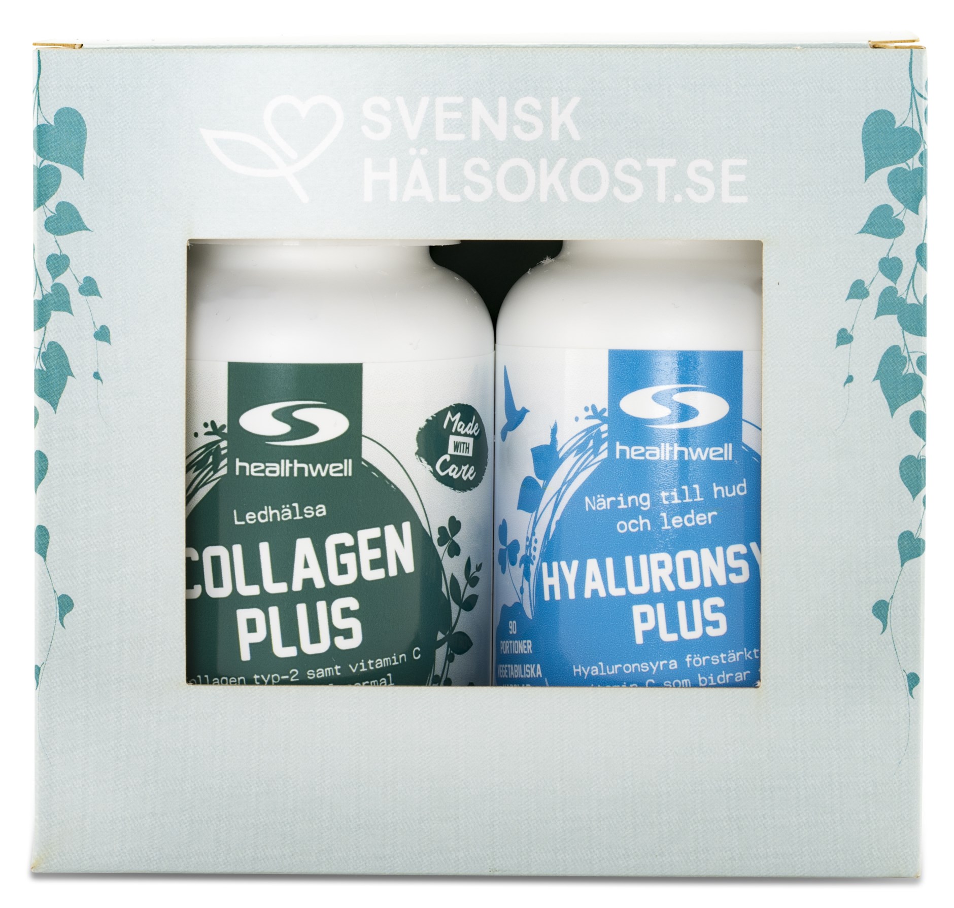 I paketet finns två tillskott som har visat sig fördelaktiga för normal ledhälsa. Hyaluronsyra Plus innehåller hyaluronsyra, som finns naturligt i kroppen och är naturligt fuktbindande, men produktionen avtar med åldern. I kroppen bildar hyaluronsyra en geléaktig vätska som fungerar stötdämpande mellan kollagenfibrer och elastinfibrer. Just kollagen utgör den andra halvan i detta ledfrämjande paket, i form av Healthwell Collagen Plus. Kollagen är ett fiberprotein som framför allt finns i olika vävnader, bland annat i ben, senor och hud. Ungefär en tredjedel av allt protein i kroppen utgörs faktiskt av kollagen! Kollagen bildar fiberstrukturer som bidrar med stadga till vävnader, vilket i sin tur gör dessa mer motståndskraftiga mot slitage. Tillsammans med hyaluronsyra som fungerar som smörjmedel mellan dessa fibrer är kollagen därför en viktig komponent i välmående leder.