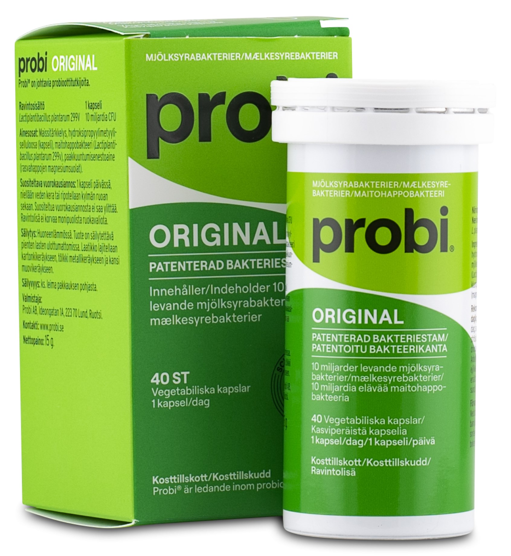 Mjölksyrabakterier från Probi Original innehåller den patenterade och noggrant studerade stammen Lactiplantibacillus plantarum 299v (LP299V®) – en stam som har bekräftats i många kliniska studier och har förmågan att överleva genom matsmältningssystemet och stanna kvar i tarmen. De vegetabiliska och glutenfria kapslarna är designade för att enkelt kunna sväljas hela eller öppnas och strös över kalla eller rumstempererade livsmedel och drycker. Probi Original är lämplig för hela familjen och kan användas från 3 års ålder.