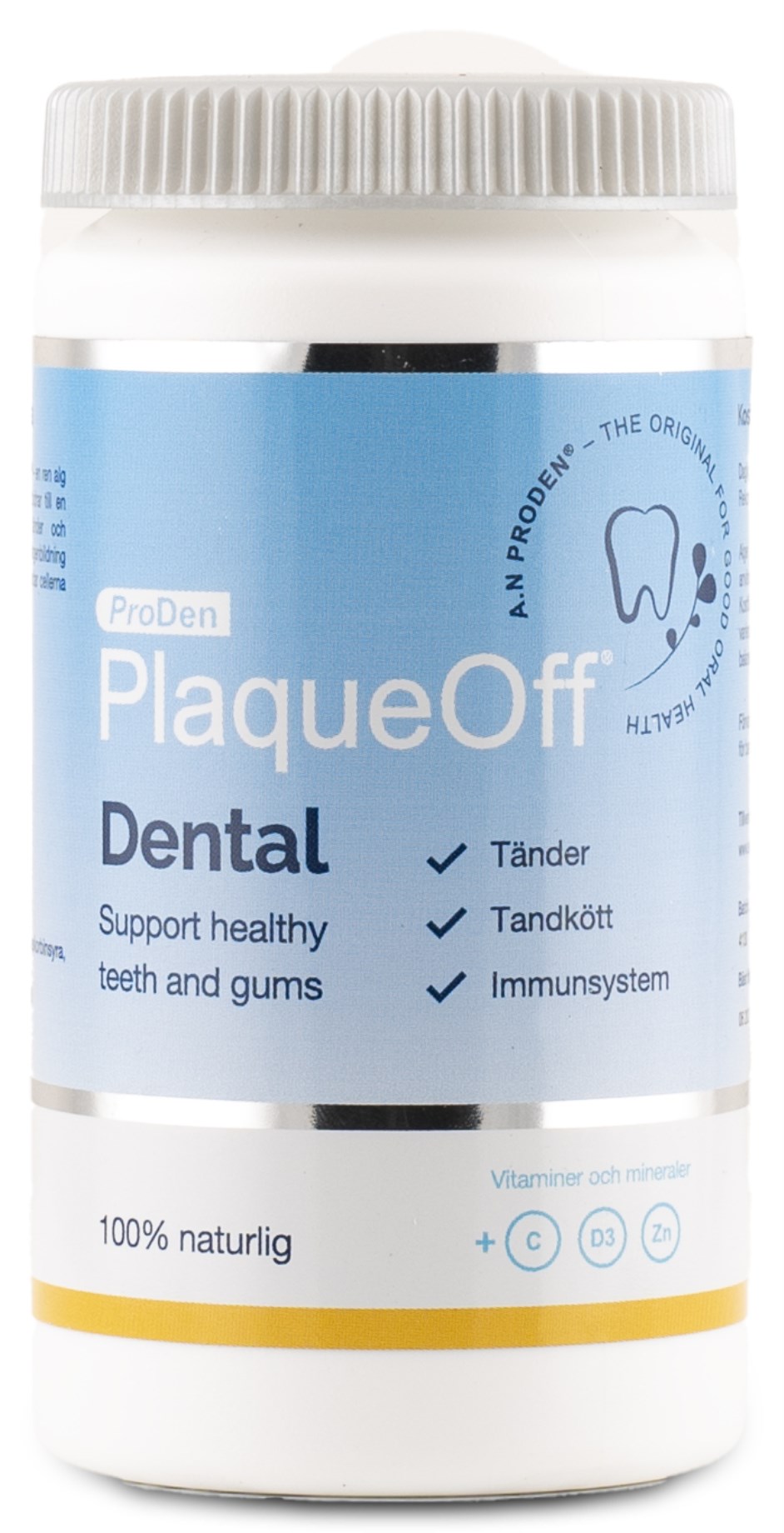 PlaqueOff® Dental från ProDen är ett 100% naturligt kosttillskott med algen A.N ProDen® som skördas i havet utanför Norges kust. Algtillskottet verkar genom salivet, och bidrar till en normal tandhälsa. Algen torkas och mals ner till ett pulver för att kunna fyllas i kapslar. PlaqueOff® Dental är ett komplement till tandborstningen, och syftet är att påverka plackens förmåga att fästa på tänder och mjuka upp befintlig tandsten.