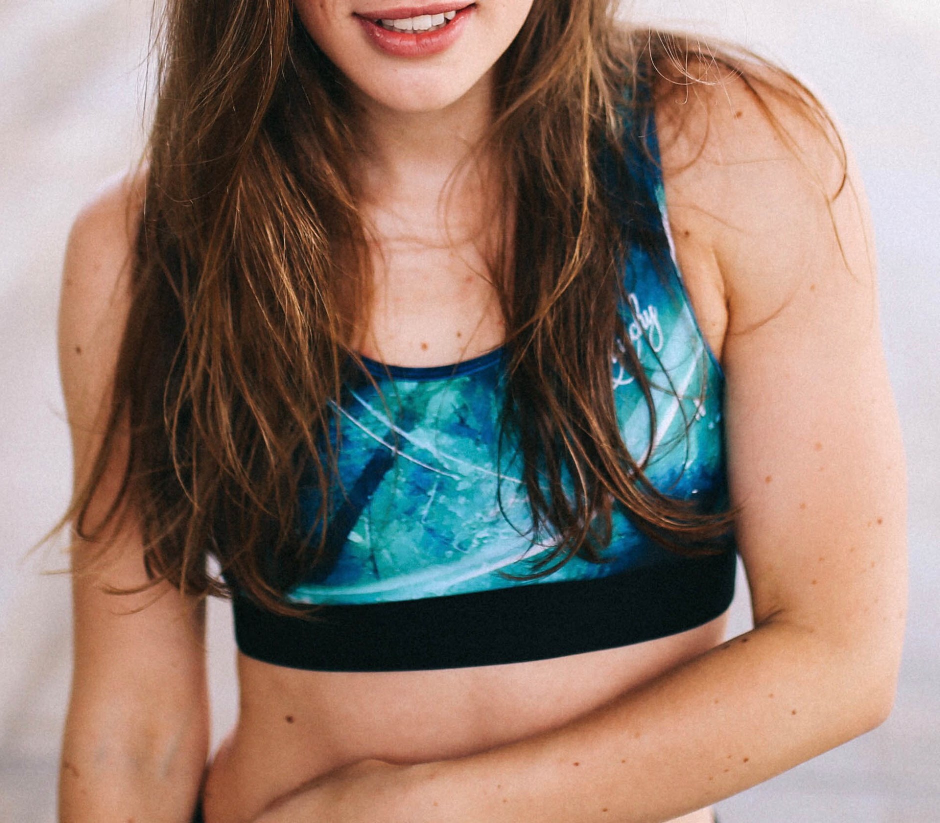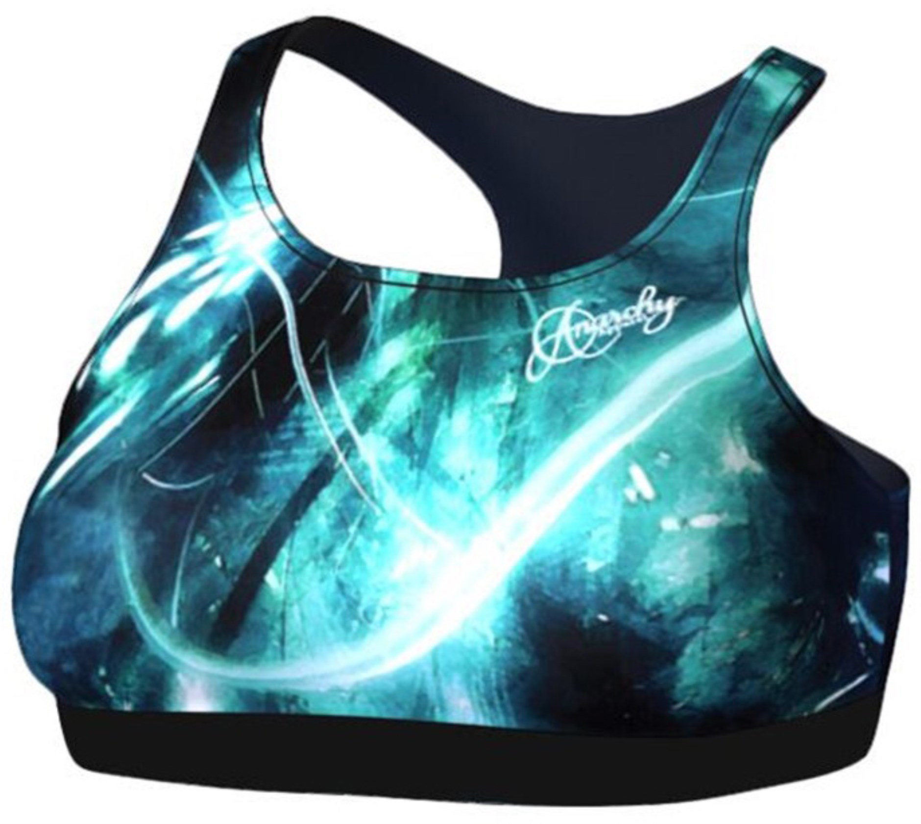 Anarchy Apparels Quantum Sport Bra är en riktigt cool sport-BH med svart och turkost mönster inspirerat av universums oändlighet. Tillverkad i ett material som andas och följer kroppens rörelser. Perfekt för både löprundan och gymmet.