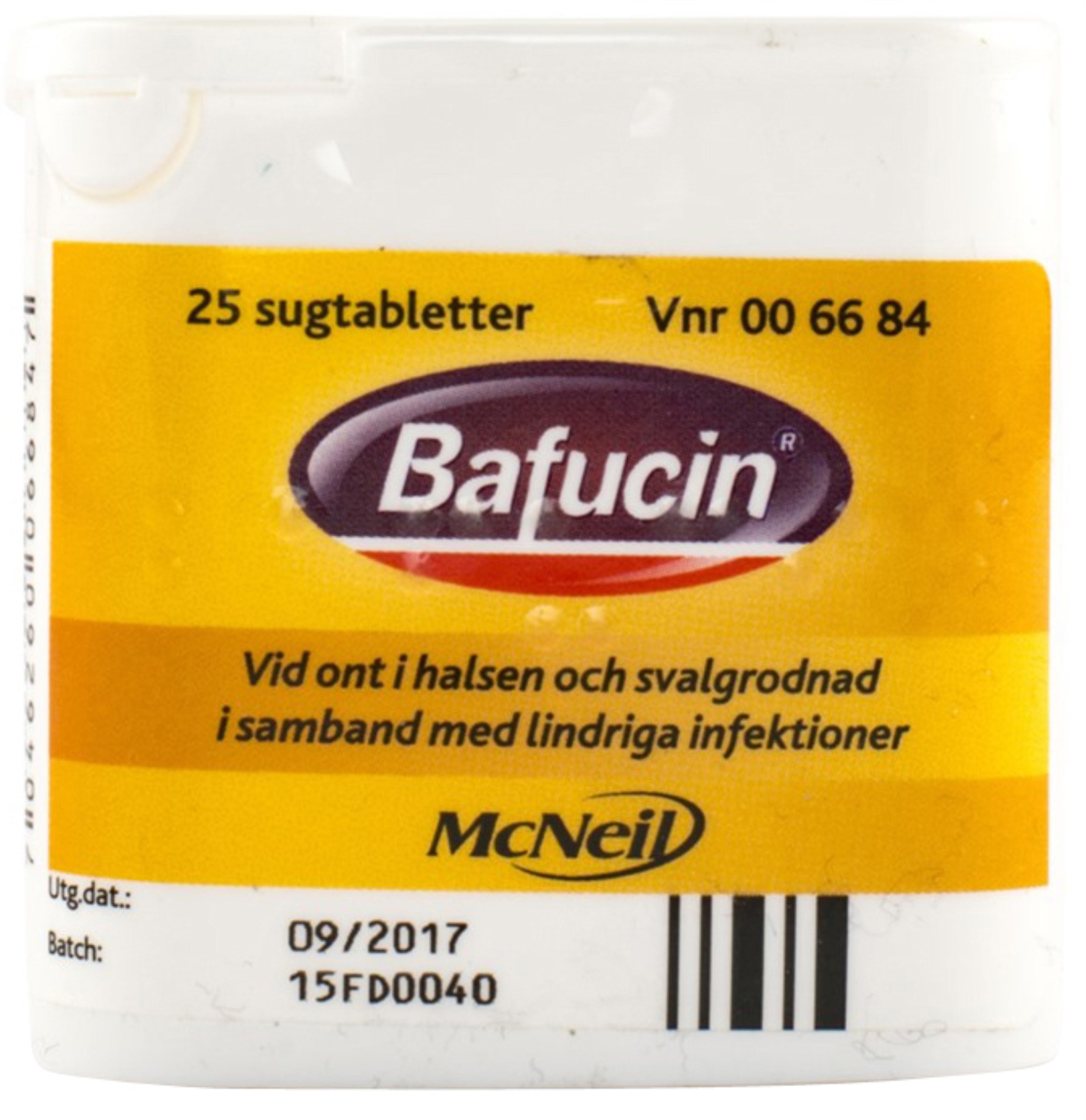 Bafucin är ett receptfritt läkemedel som hjälper dig vid halsont och rodnat i svalget när du är förkyld. Bafucin innehåller tre antibakteriella ämnen som verkar lokalt i halsen, samtidigt som Bafucin innehåller ämnen som hjälper till att lindra smärtan.