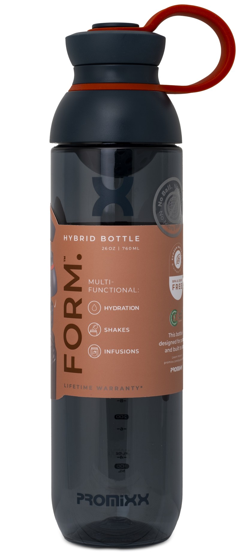 PROMiXX Form Hybrid Bottle är en smart och praktisk flaska i ECOZEN™, ett biobaserat och tåligt material som håller smaken ren. Den är lukt- och smakresistent och lätt att diska. Flaskan rymmer 760 ml och har ett smidigt lock med integrerad bärloop som är smidig i handen. Tack vare det rundade snap-fit-agitatorsystemet blandar du dina pulver både snabbt och jämnt. Form Hybrid Bottle är helt tät och passar perfekt för proteinshakes, vatten, smoothies, och EAA. Flaskan är helt fri från hormonstörande ämnen (BPA, BPS och DEHP). En smidig flaska för alla dina drycker!
