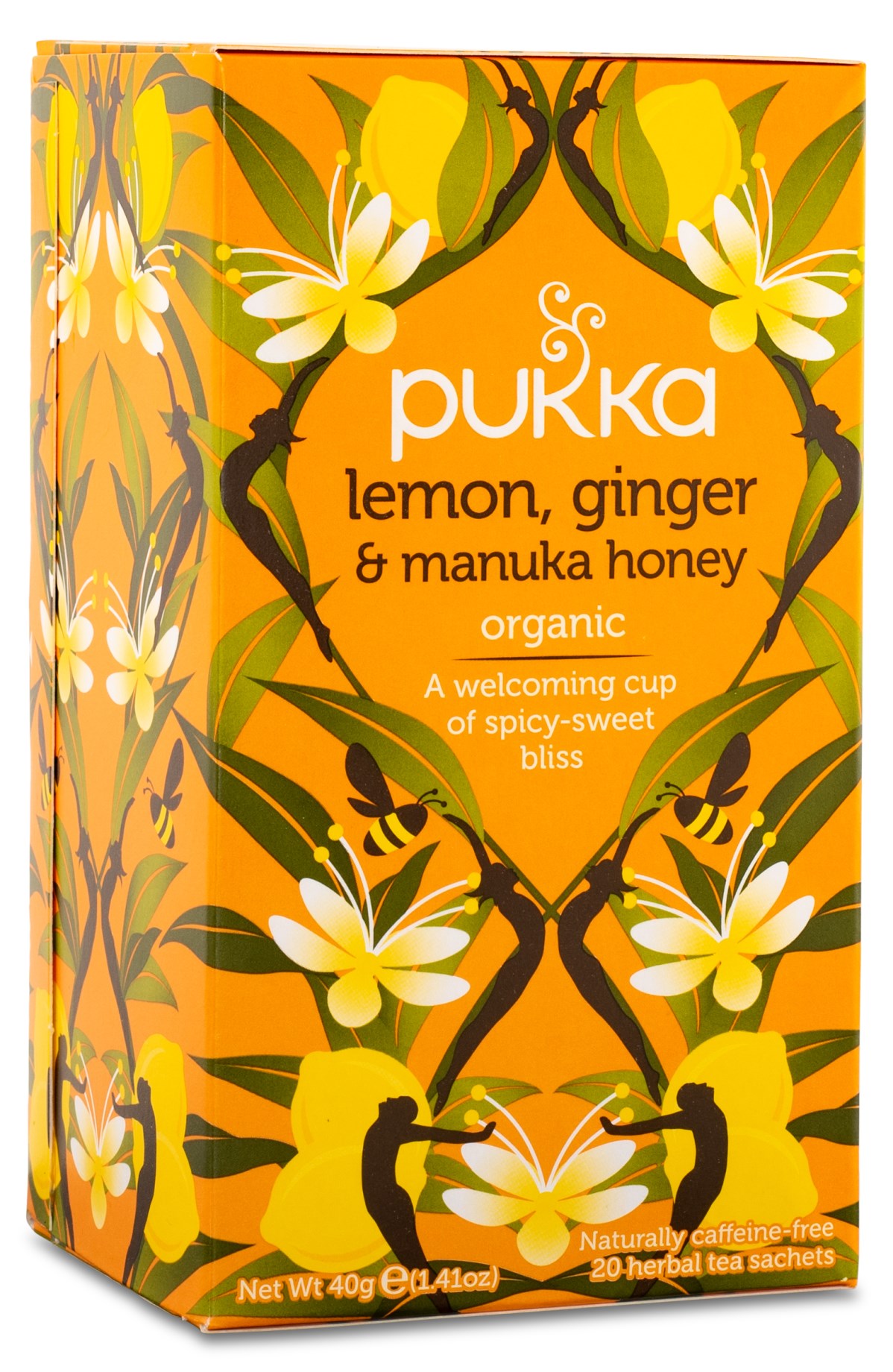 Värm dig i kylan med Pukka Te Lemon, Ginger & Manuka. Den härliga sötman från manukahonung balanserar upp den syrliga tonen av citron, medan ekologiskt odlad ingefära ger en djup, kryddig touch till din kopp. Pukka Te Lemon, Ginger & Manuka känns värmande och behaglig under kyliga kvällar, både för kropp och själ. Njut av en kopp te oavsett tid på dygnet - Pukka Lemon, Ginger & Manuka är naturligt koffeinfri och passar därför bra att drickas på kvällen. Som alltid är Pukkas örter ekologiska och teet är fritt från artificiella tillsatser.