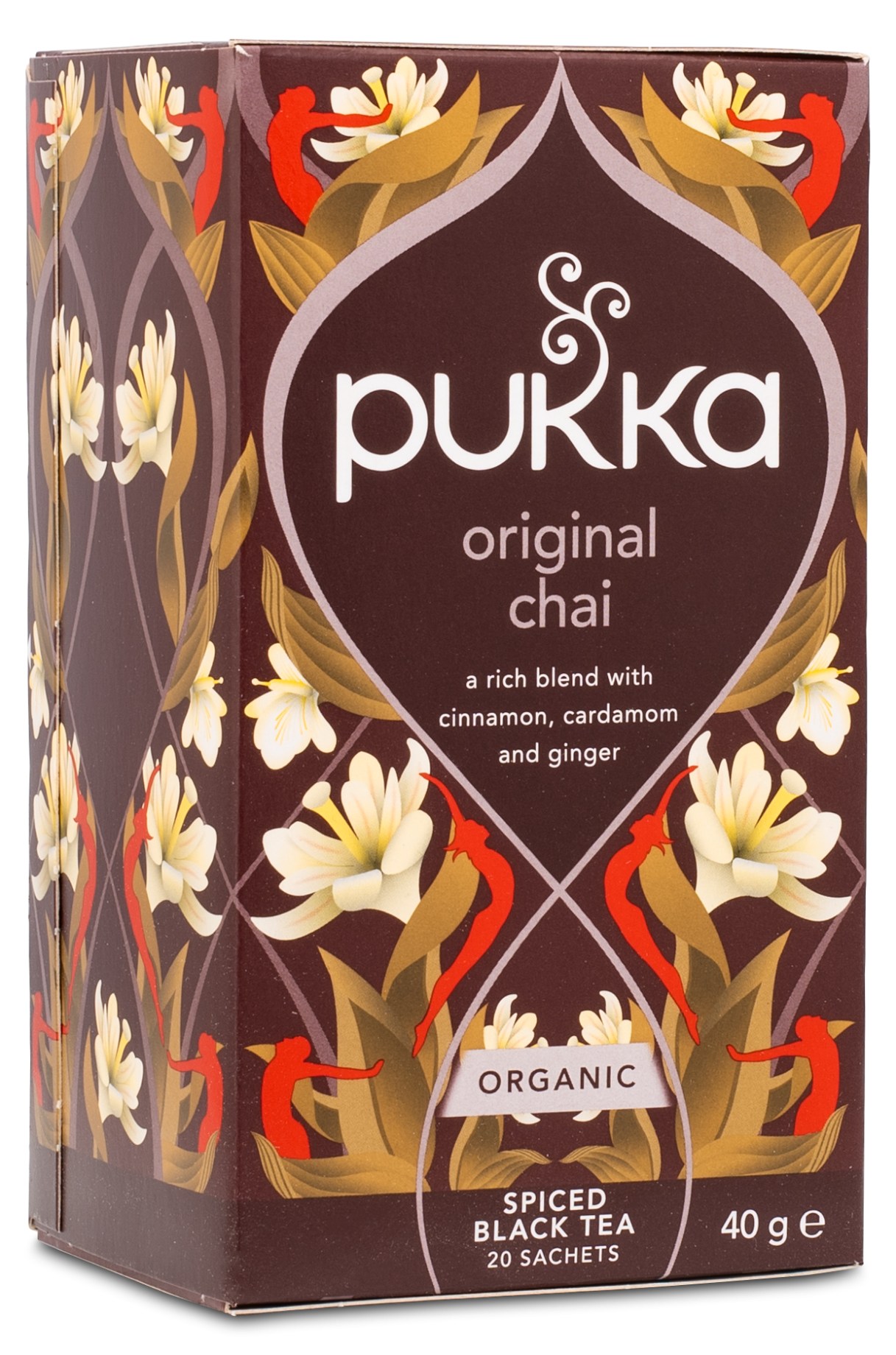 Pukka Te Original Chai är ett smakrikt svart te med bland annat ingefära, kryddig kanel och kardemumma med en hint av lakrits. Ingredienserna är ekologiska och rättvisemärkta.
