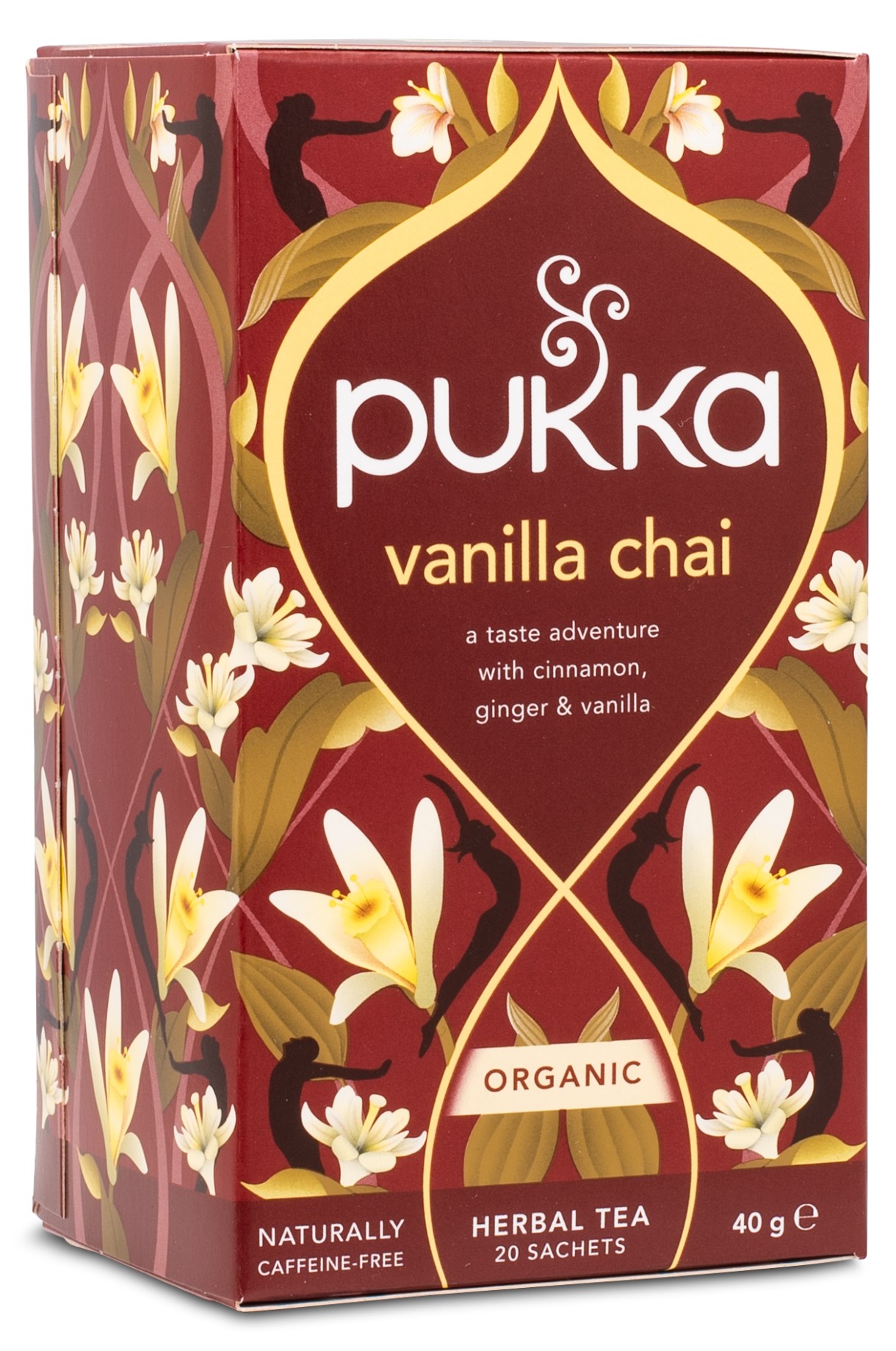 Pukka Te Vanilla Chai består av en mix av sex ekologiska och Fairtrade-certifierade örter från små, självständiga odlare globalt. Kanel och ingefära ger en värmande effekt, medan kardemumma och fänkål bidrar med härliga aromer. Lakrits och vanilj tillför en söt och lugnande känsla.